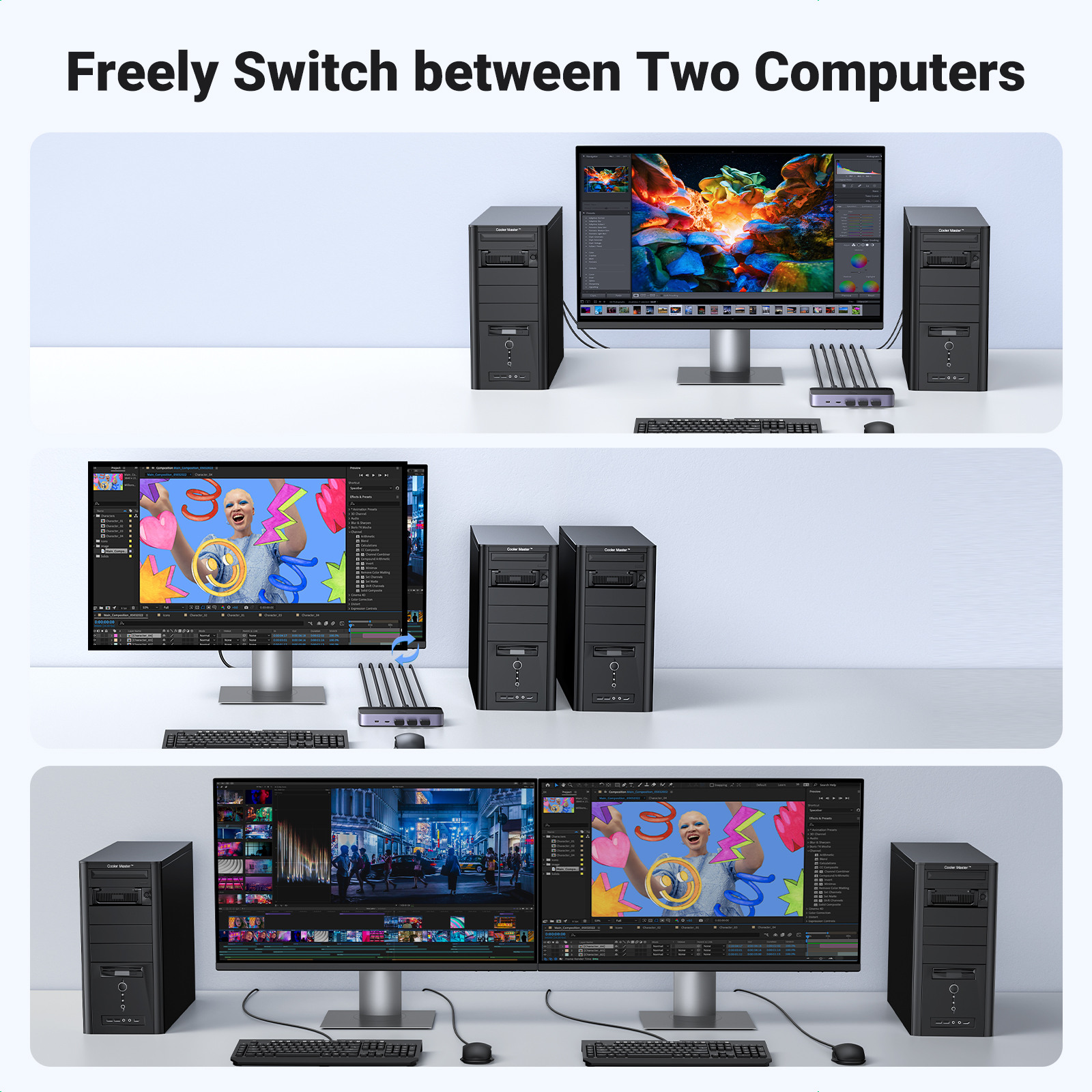 Ce commutateur KVM permet à deux ordinateurs de partager jusqu'à quatre périphériques USB 3.0 tels que clavier, souris, disques durs, clé USB et imprimante, et de contrôler les deux ordinateurs de manière centralisée à partir d'un seul écran. Vous pouvez facilement passer d'un hôte à l'autre, ce qui permet non seulement de garder votre espace de travail bien rangé, mais aussi d'optimiser votre productivité et la qualité de vos images.