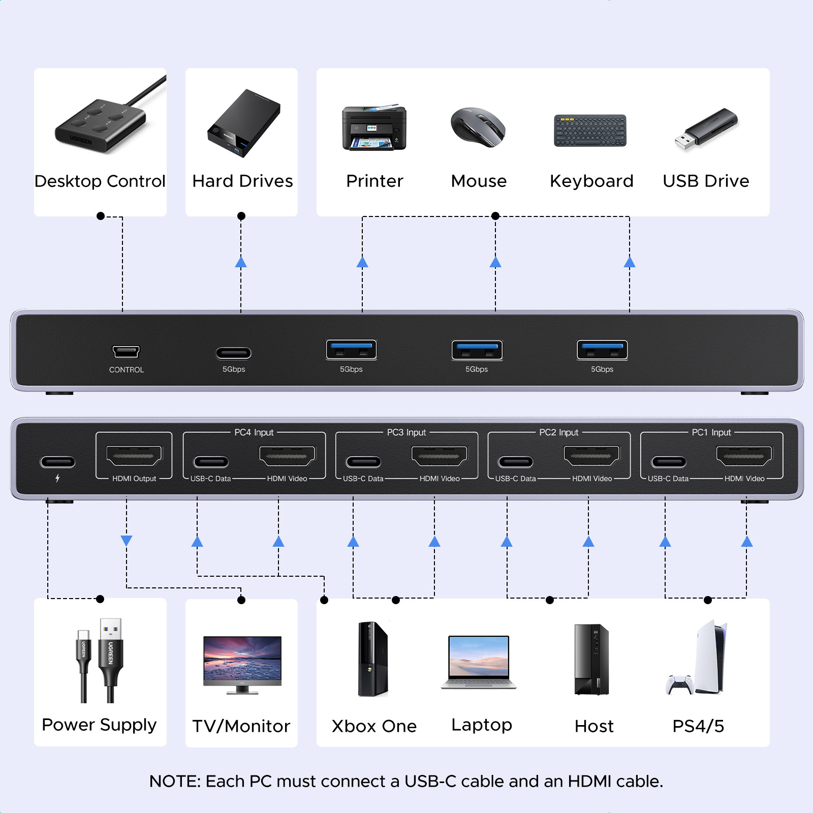 - Remarques importantes : 1.chaque ordinateur doit être connecté à un câble HDMI (pour la transmission vidéo) et à un câble USB de type A vers type C (pour la transmission de données) pour fonctionner correctement. 2.le port USB-C du produit ne prend pas en charge la fonction vidéo, si l'écran a une image, vous devez connecter HDMI-In.3.pour assurer un fonctionnement stable, veuillez connecter l'appareil à une source d'alimentation. 4. non compatible avec l'utilisation de stations d'accueil. 5. si vous connectez un ordinateur portable, assurez-vous qu'il est sorti du mode veille avant de changer de mode.