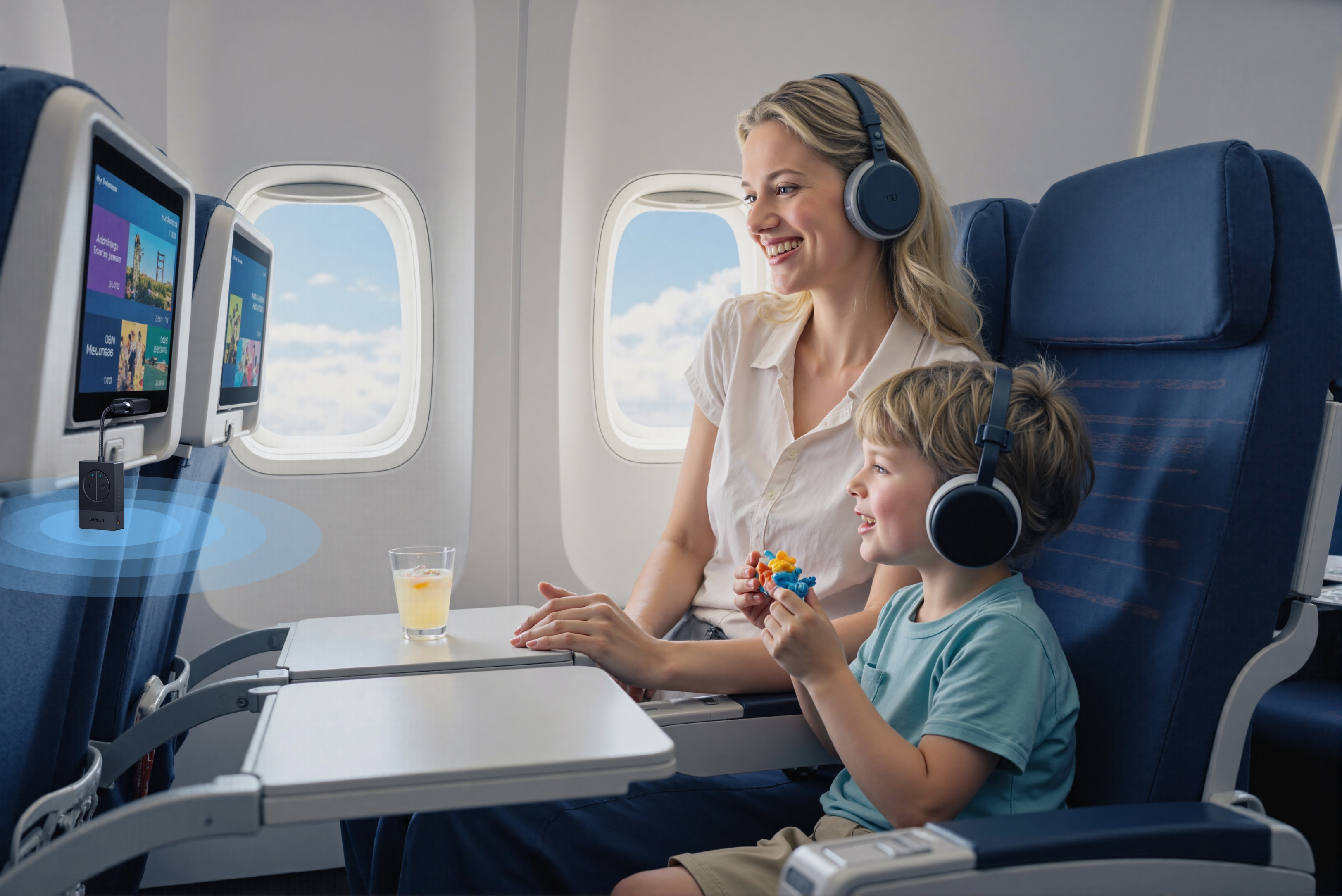 - Doubles prises jack 3,5 mm (avions) : Connectez l'adaptateur AUX double 3,5 mm à la prise jack 3,5 mm de l'émetteur, puis branchez l'adaptateur dans les connecteurs audio de l'avion.