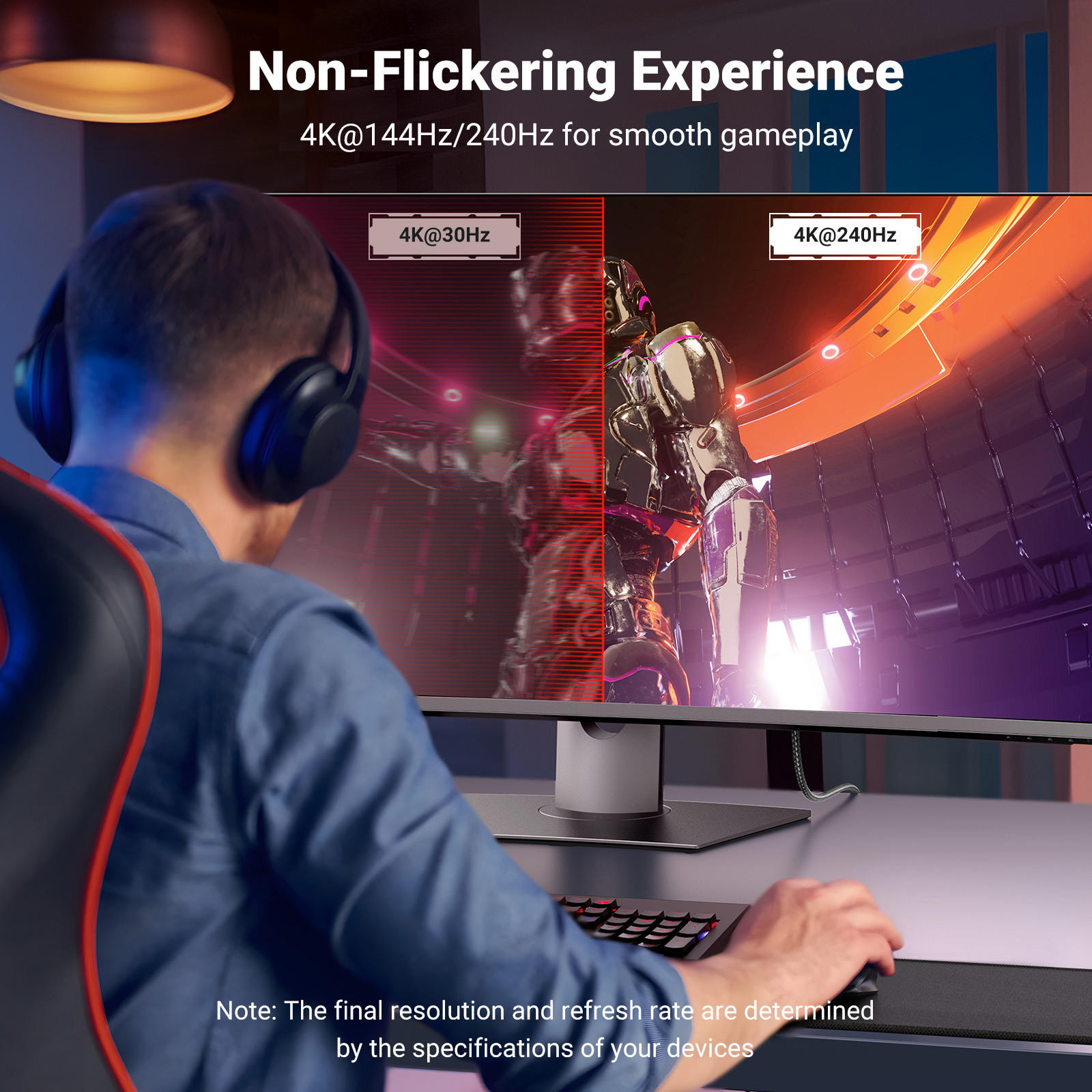 - Faites l'expérience d'un nouveau niveau de jeu : ce câble USB-C vers DisplayPort 1.4 offre une bande passante pouvant atteindre 32,4 Gbit/s, soit 50 % de plus qu'un câble DP 1.2. Ainsi, vous ne transmettez pas seulement des signaux vidéo haute résolution, mais vous profitez également de FreeSync et G-Sync, indispensables pour les jeux. VRR et ALLM garantissent une expérience de jeu plus fluide, notamment dans les jeux FPS, 3A et MOBA.