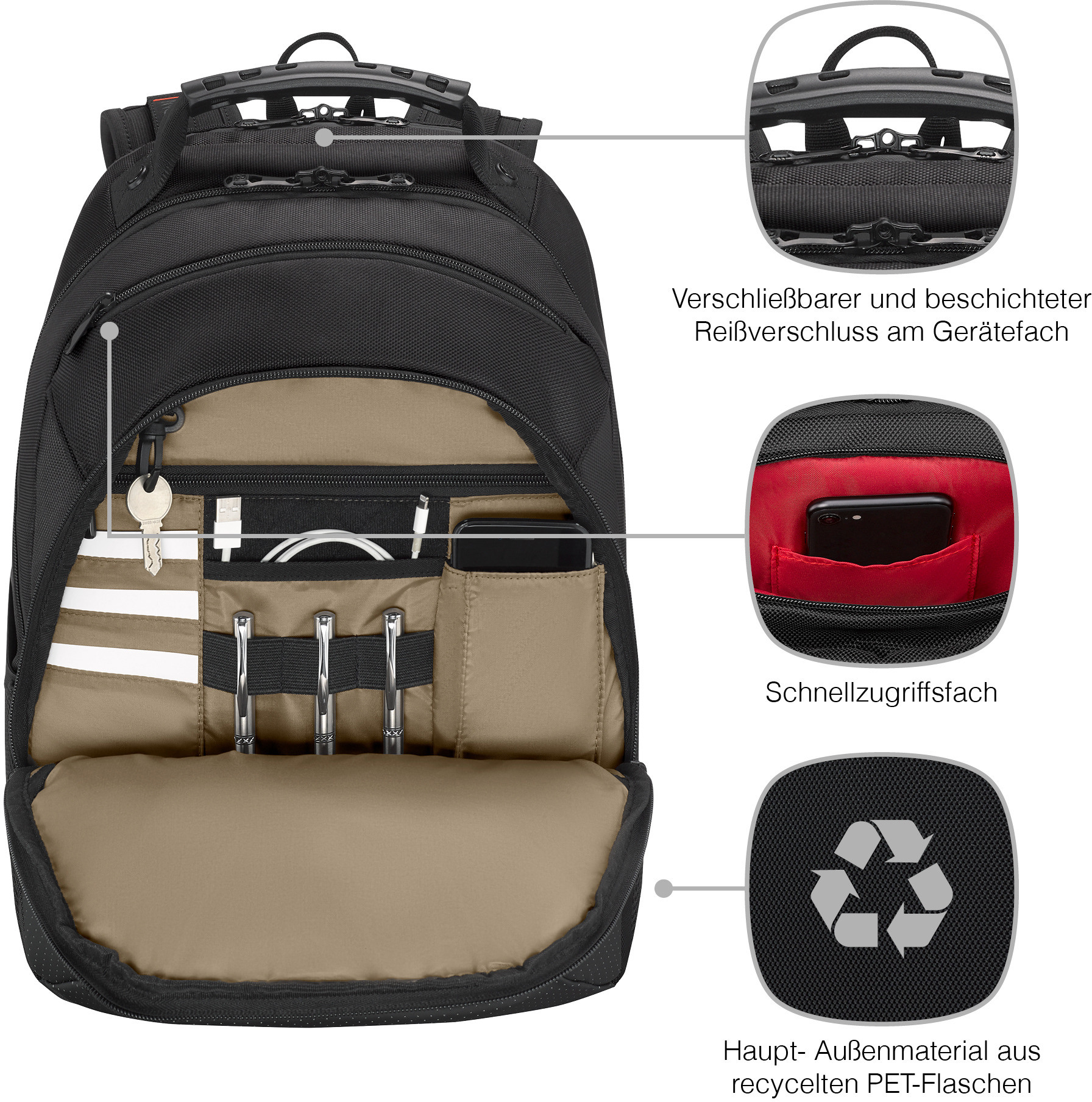 Voyagez encore plus sereinement avec le Legacy Black Series Laptop Backpack. Il est parfait pour les hommes d'affaires actifs et dispose d'un matériau extérieur robuste fabriqué à partir de bouteilles PET recyclées. Le compartiment rembourré Triple Protect, doté de fermetures à glissière verrouillables et hydrofuges, peut accueillir un ordinateur portable jusqu'à 16″ ; un autre compartiment permet de ranger votre tablette 10″. Le rembourrage dorsal respirant et les bandoulières amortissant les chocs sont particulièrement confortables. La poche d'accès rapide vous permet de ranger vos affaires les plus importantes, tandis que les objets de valeur sont en sécurité dans la poche de sécurité cachée. Avec la sangle de trolley et la plateforme de stabilisation CaseBase, voyager devient un jeu d'enfant.