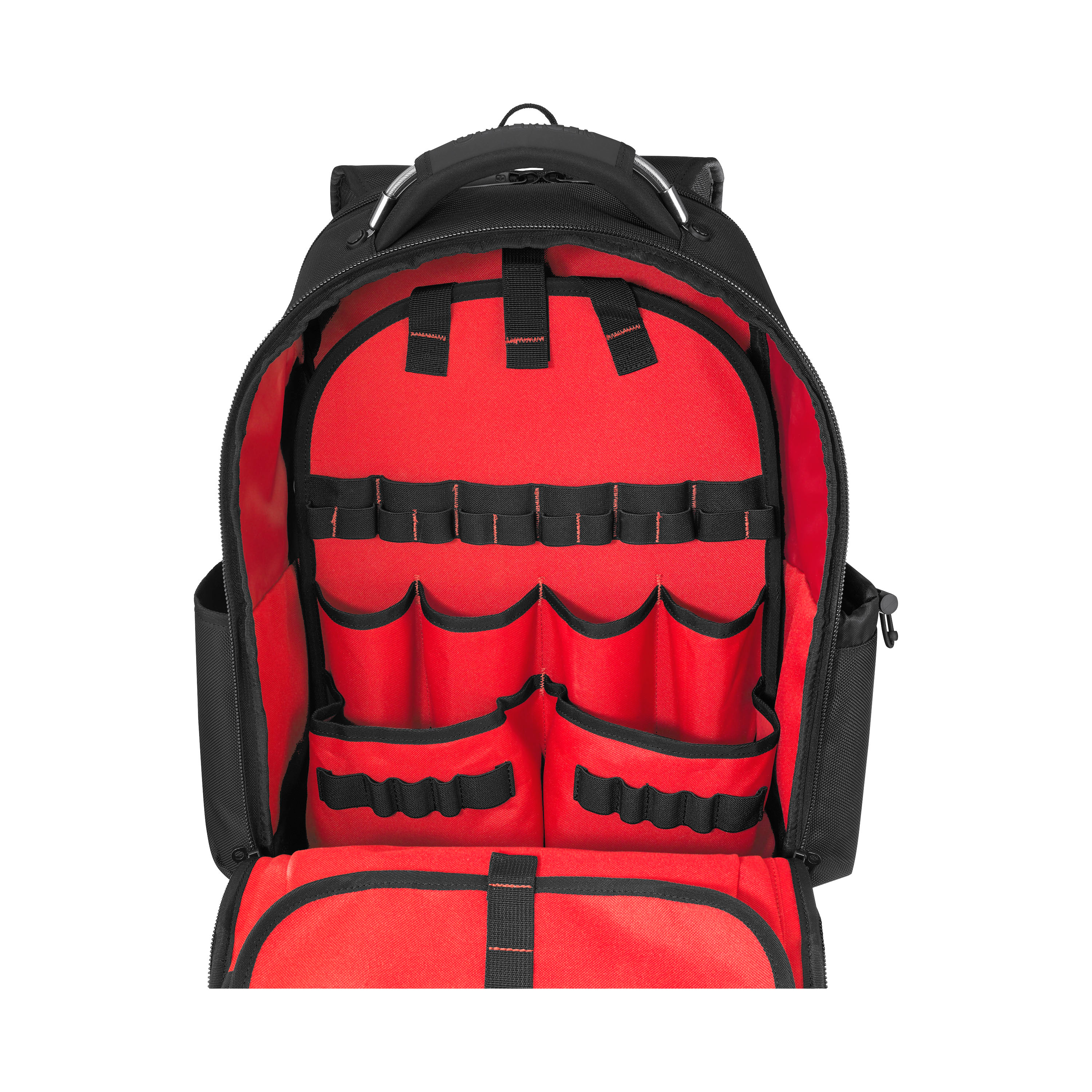 Avec le Tool Backpack Pro pour les plombiers et les installateurs, les techniciens et les spécialistes du bâtiment, chaque tâche est accomplie avec facilité. Le sac à dos pour outils a un matériau extérieur principal robuste, fabriqué à partir de bouteilles en PET recyclées, un compartiment pour ordinateur portable 17 ″, un compartiment principal spacieux avec un porte-outils amovible, un compartiment à lunettes incassable et plusieurs compartiments pour les petits objets. Qu'il s'agisse de marteaux, de tournevis, de câbles ou de mètres rubans, vous avez tout à portée de main dans ce sac à dos. Restez connecté en route grâce au port USB intégré. Le rembourrage dorsal respirant et les bretelles Comfort-Fit assurent le confort nécessaire. Grâce aux fermetures à glissière verrouillables du compartiment principal et au fond dur moulé en EVA, vous pouvez être sûr que le Tool Backpack Pro fera passer votre travail au niveau supérieur.