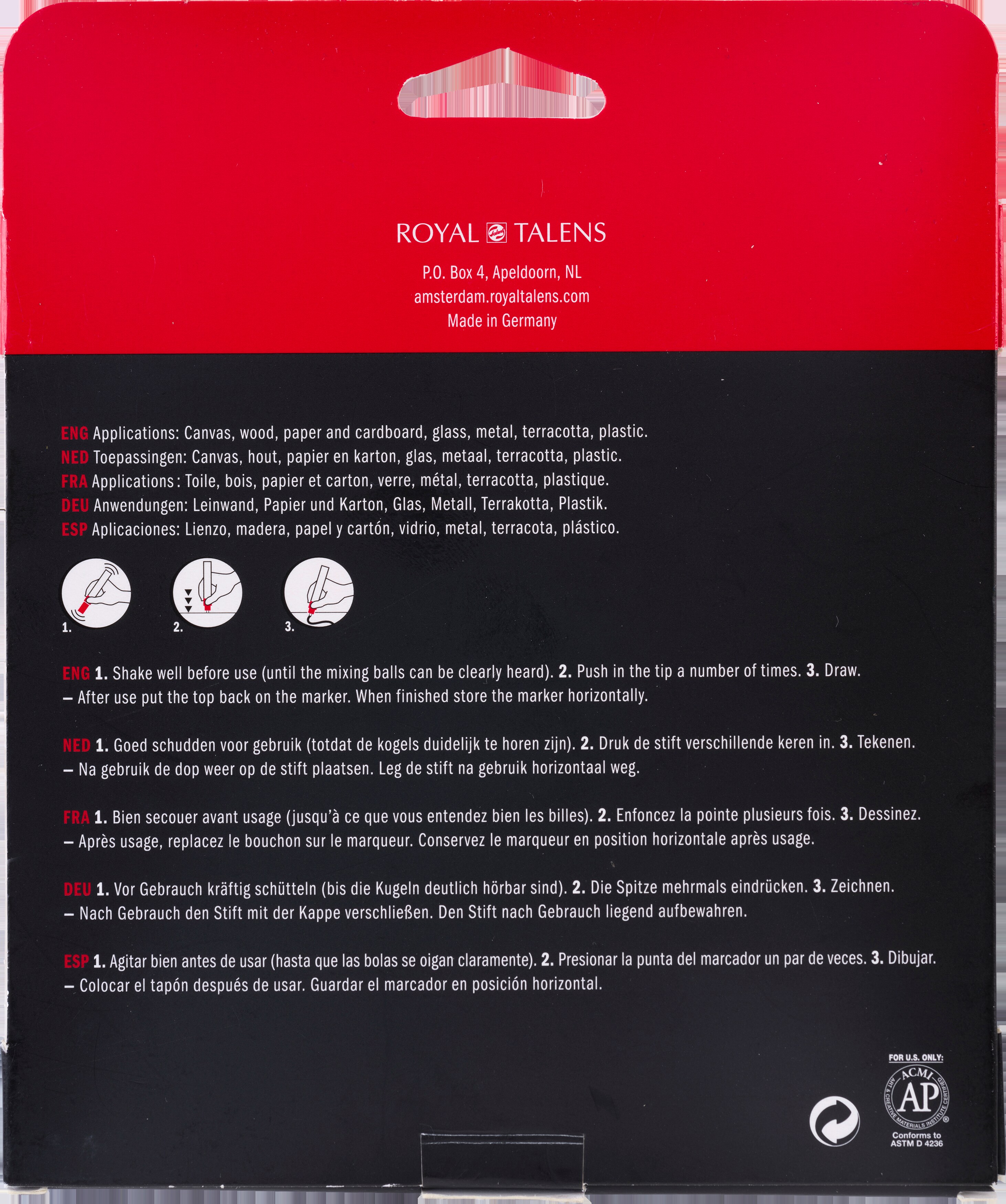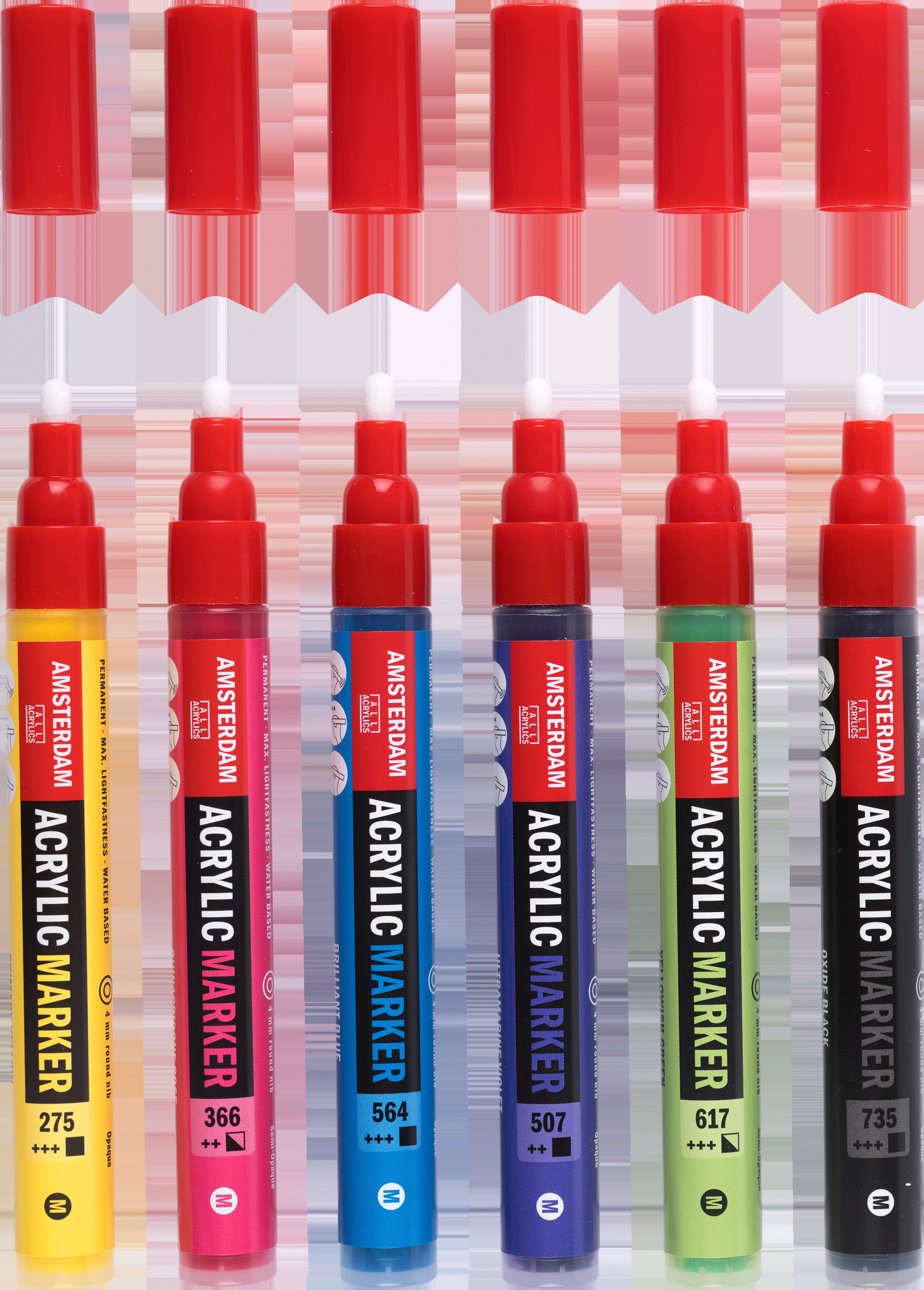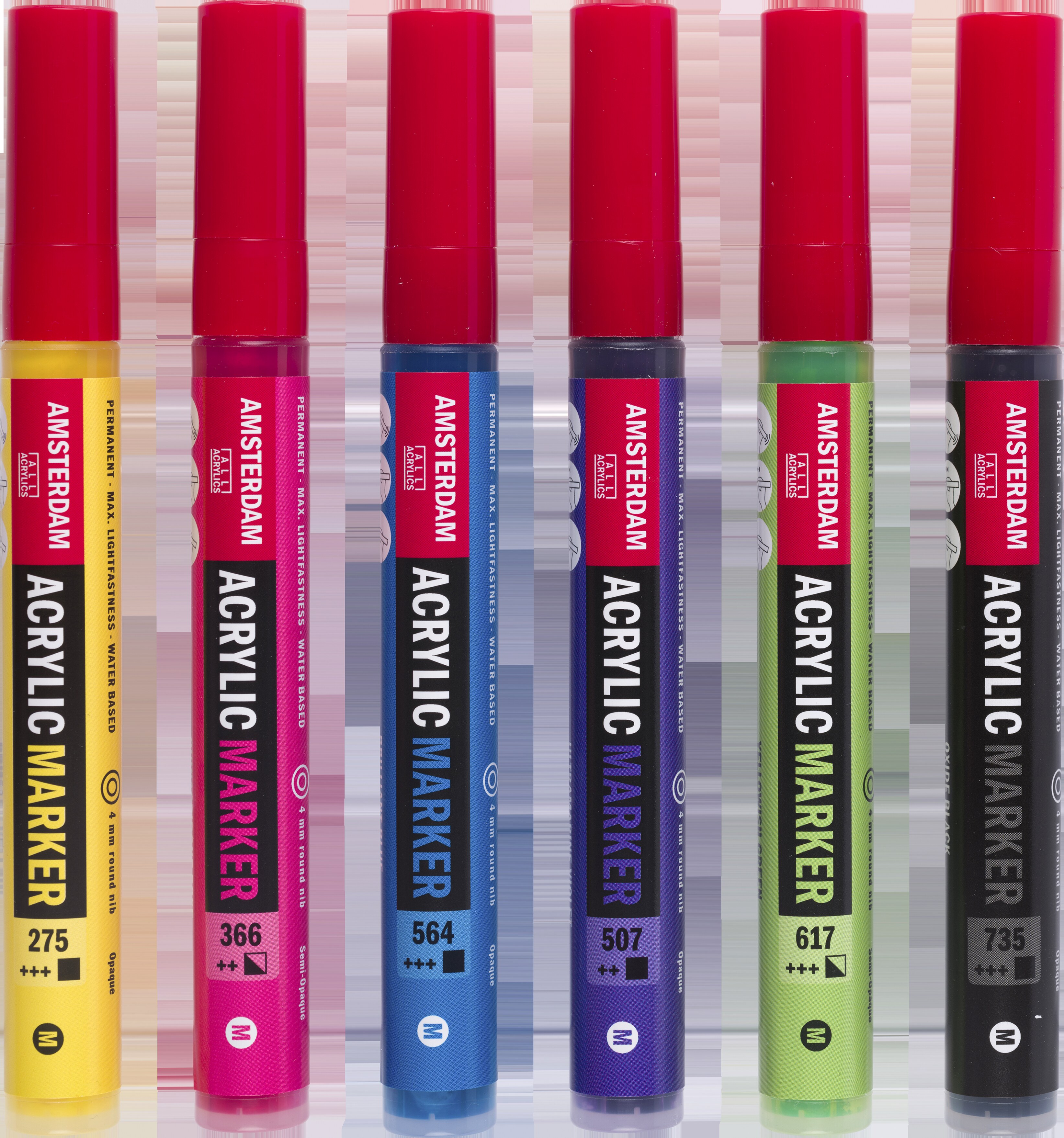 Dieses Einsteigerset eignet sich ideal, um mit den Amsterdam Acrylmarkern zu beginnen. Das Set enthält 6 Marker mit einer mittelgrossen, runden Spitze (4 mm) in Basisfarben. Inhalt: 6 Marker (275 Primärgelb – 366 Chinacridonrosa – 564 Brillantblau – 507 Ultramarinviolett – 617 Gelbgrün – 735 Oxidschwarz). Amsterdam Acrylmarker Unsere Acrylmarker bieten eine einfache Lösung, um deutliche Linien zu ziehen und deinem Acrylgemälde den letzten Schliff zu geben. Verwende diese Marker, um Strichzeichnungen und Skizzen zu erstellen und um schnell Farbakzente direkt auf deiner Arbeit zu setzen. Schüttle den Marker vor dem Gebrauch mit aufgesetzter Kappe, damit die Tinte zu fliessen beginnt und sich die Farbe mit dem Bindemittel vermischt. Halte den Marker aufrecht und drücke auf die Spitze, um den Innendruck abzubauen. Die Tinte beginnt zur Spitze zu fliessen, und dein Marker ist einsatzbereit. Setze die Kappe nach dem Gebrauch wieder fest auf und lagere den Marker waagerecht. Hergestellt mit hochwertigen, lichtechten Pigmenten Die geruchsneutrale, wasserbasierte Formel wird nach dem Trocknen wasserfest und dauerhaft Umfangreiche Palette von 46 Farben mit einer grossen Vielfalt an verschiedenen Deckgraden, einschliesslich Reflex- und Metallic-Tönen In 3 verschiedenen Grössen erhältlich (2 mm runde Spitze, 4 mm runde Spitze, 15 mm quadratische Spitze) und dadurch sehr vielseitig Beidseitig verwendbare, austauschbare Spitzen sorgen für eine besonders lange Lebensdauer (zusätzliche Spitzen separat erhältlich) Einfach in der Anwendung und haftet auf praktisch allen leicht porösen Oberflächen, einschliesslich Leinwand, Papier, Pappe, Holz, Stein und Beton Mit Stolz in Europa hergestellt