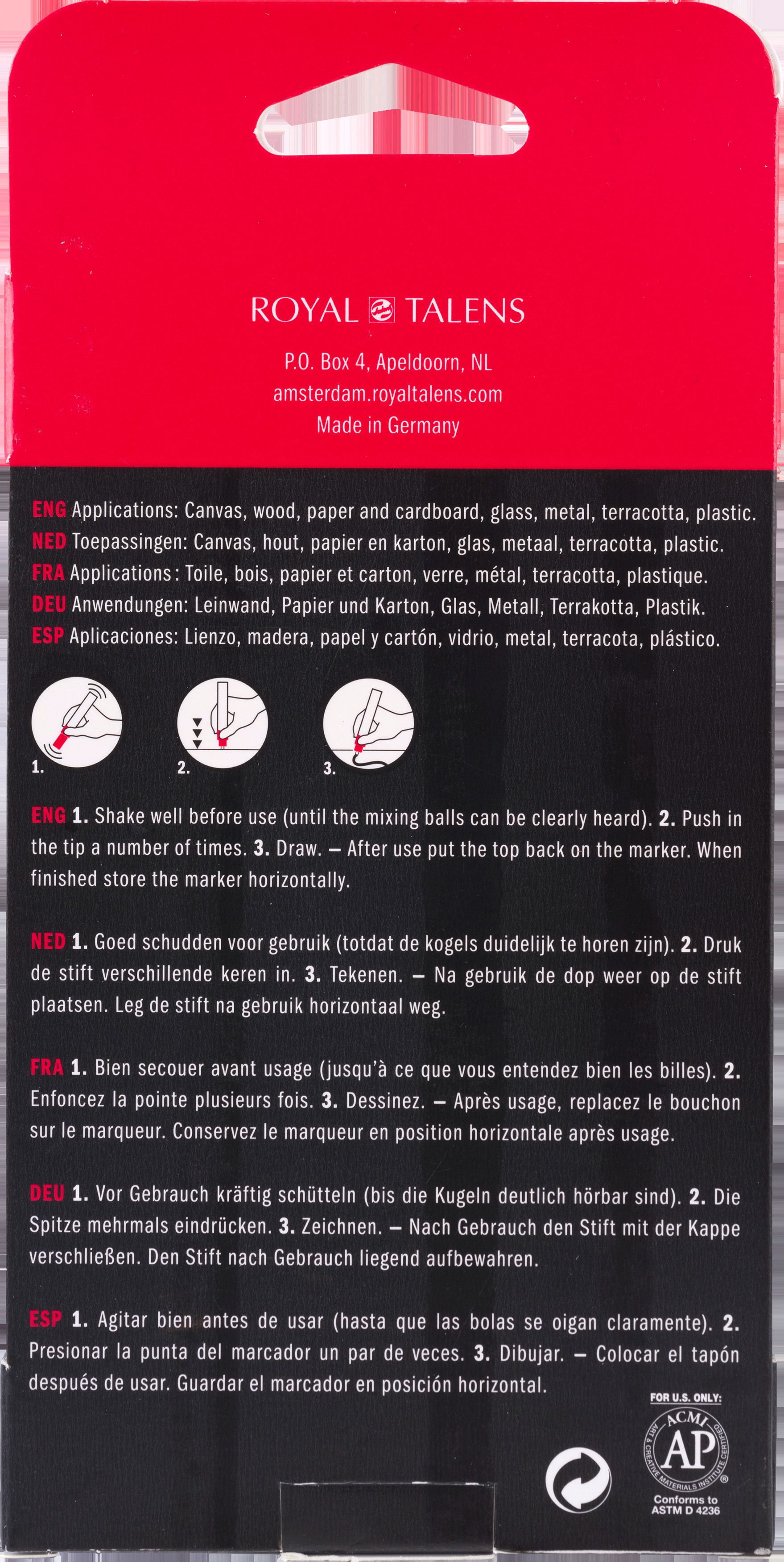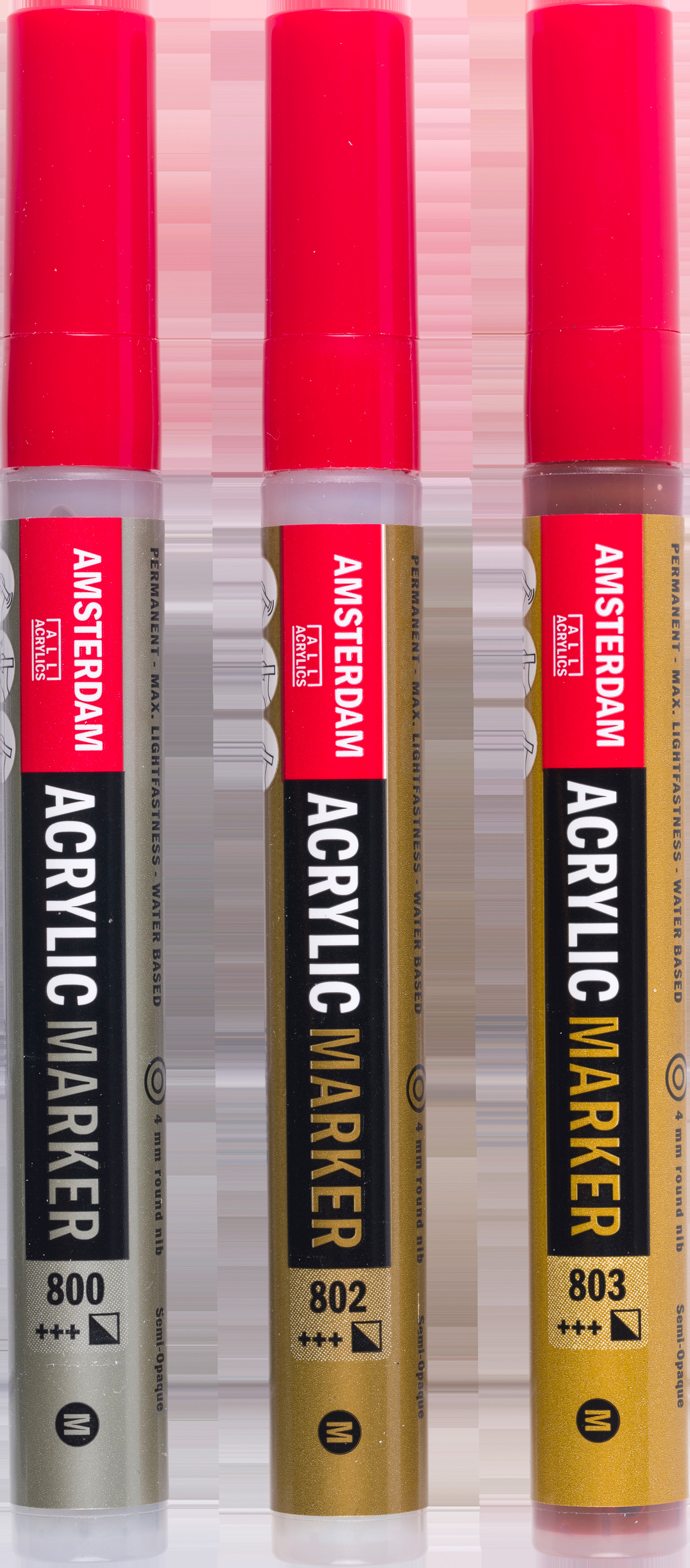 Dieses Set eignet sich ideal, um mit den Amsterdam Acrylmarkern zu beginnen. Das Set enthält 3 Marker mit einer mittelgrossen, runden Spitze (4 mm) in leuchtenden Metallicfarben. Inhalt: 3 Marker (800 Silber – 802 Reichgold - 803 Dunkelgold). Amsterdam Acrylmarker Unsere Acrylmarker bieten eine einfache Lösung, um deutliche Linien zu ziehen und deinem Acrylgemälde den letzten Schliff zu geben. Verwende diese Marker, um Strichzeichnungen und Skizzen zu erstellen und um schnell Farbakzente direkt auf deiner Arbeit zu setzen. Schüttle den Marker vor dem Gebrauch mit aufgesetzter Kappe, damit die Tinte zu fliessen beginnt und sich die Farbe mit dem Bindemittel vermischt. Halte den Marker aufrecht und drücke auf die Spitze, um den Innendruck abzubauen. Die Tinte beginnt zur Spitze zu fliessen, und dein Marker ist einsatzbereit. Setze die Kappe nach dem Gebrauch wieder fest auf und lagere den Marker waagerecht. Hergestellt mit hochwertigen, lichtechten Pigmenten Die geruchsneutrale, wasserbasierte Formel wird nach dem Trocknen wasserfest und dauerhaft Umfangreiche Palette von 46 Farben mit einer grossen Vielfalt an verschiedenen Deckgraden, einschliesslich Reflex- und Metallic-Tönen In 3 verschiedenen Grössen erhältlich (2 mm runde Spitze, 4 mm runde Spitze, 15 mm quadratische Spitze) und dadurch sehr vielseitig Beidseitig verwendbare, austauschbare Spitzen sorgen für eine besonders lange Lebensdauer (zusätzliche Spitzen separat erhältlich) Einfach in der Anwendung und haftet auf praktisch allen leicht porösen Oberflächen, einschliesslich Leinwand, Papier, Pappe, Holz, Stein und Beton Mit Stolz in Europa hergestellt