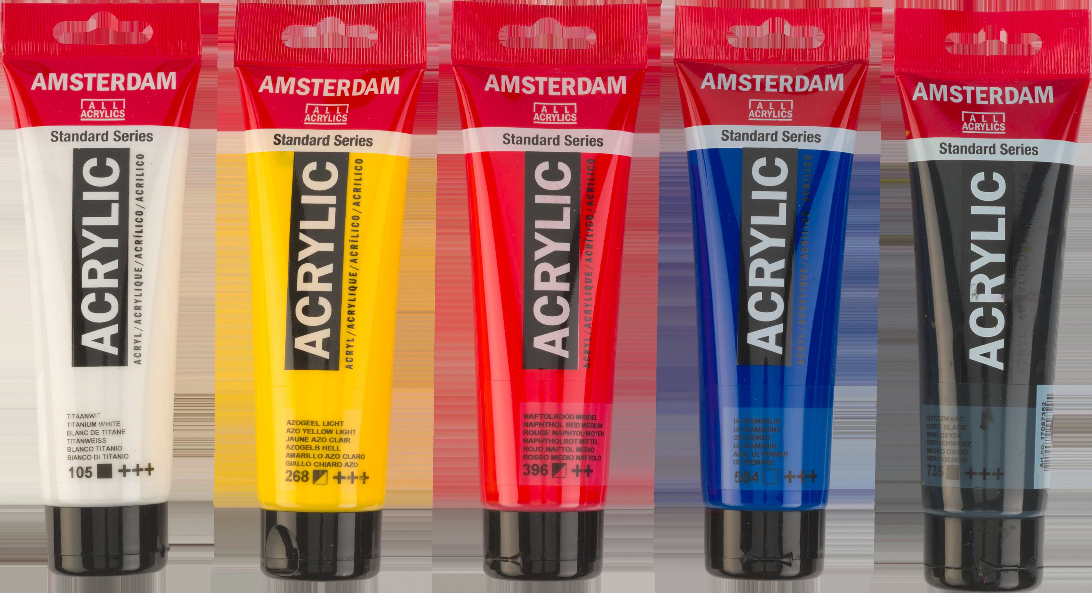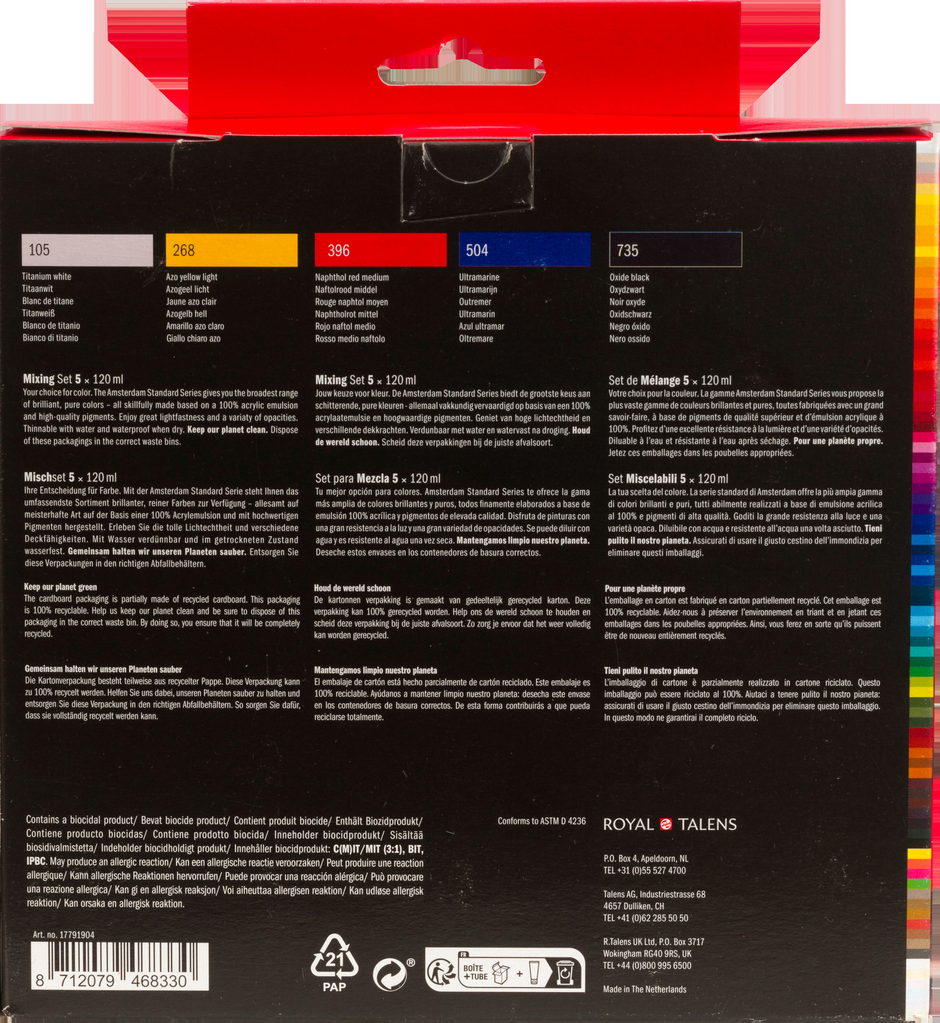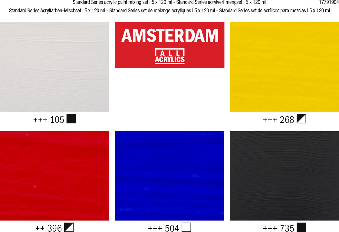Das Set bietet dir 5 tolle Grundfarben in grossen Tuben: Titanweiss, Oxidschwarz und drei warme Mischfarben – Azogelb hell, Naphtholrot mittel und Ultramarin. Dies sind die perfekten Mischfarben für deine erste Farbpalette. Mische diese Farben, um eine endlose Variation verschiedener Schattierungen zu erhalten. Inhalt: 5 x 120 ml (105 Titanweiss – 268 Azogelb hell – 396 Naphtholrot mittel – 504 Ultramarin – 735 Oxidschwarz). Amsterdam Standard Series Unsere Standardserie bietet dir die umfangreichste Palette an bemerkenswert lebendigen Acrylfarben. Diese vielseitige Farbe ist leicht zu verarbeiten und lässt sich einfach auftragen. Du kannst die Farbe entweder direkt aus der Tube verwenden oder mit Wasser oder einem unserer Acrylmalmittel verdünnen. Farbe von mittlerer Viskosität für sichtbare Pinselstriche, Struktur und gleichmässige Deckkraft mit seidenmattem Finish. Hergestellt mit hochwertigen, lichtechten Pigmenten Formuliert mit 100 % Acrylharzbindemittel, was zu einem aussergewöhnlich haltbaren und flexiblen Farbfilm mit gleichmässigem Glanz führt Die geruchsneutrale, wasserbasierte Formel wird nach dem Trocknen wasserfest und dauerhaft Umfangreiche Palette aus 102 Farben mit einer grossen Vielfalt im Bereich Deckkraft, darunter 23 Spezialfarben (Metallic-, Perl- und Reflexfarben) Haftet auf praktisch allen leicht porösen Oberflächen, einschliesslich Leinwand, Papier, Pappe, Holz, Stein und Beton Mit Stolz in den Niederlanden hergestellt Gemeinsam halten wir unseren Planeten sauber Wir möchten die Welt mit unseren Produkten aufregend und farbenfroh machen, aber wir wollen auch unseren Planeten schützen. Darum arbeiten wir unermüdlich daran, unseren Kunststoffverbrauch zu reduzieren und suchen nachhaltigere Alternativen. Diese 100 % recycelbare Verpackung ist aus recycelter Pappe hergestellt, die lokal beschafft und produziert wurde, um den CO2-Fussabdruck noch weiter zu reduzieren.