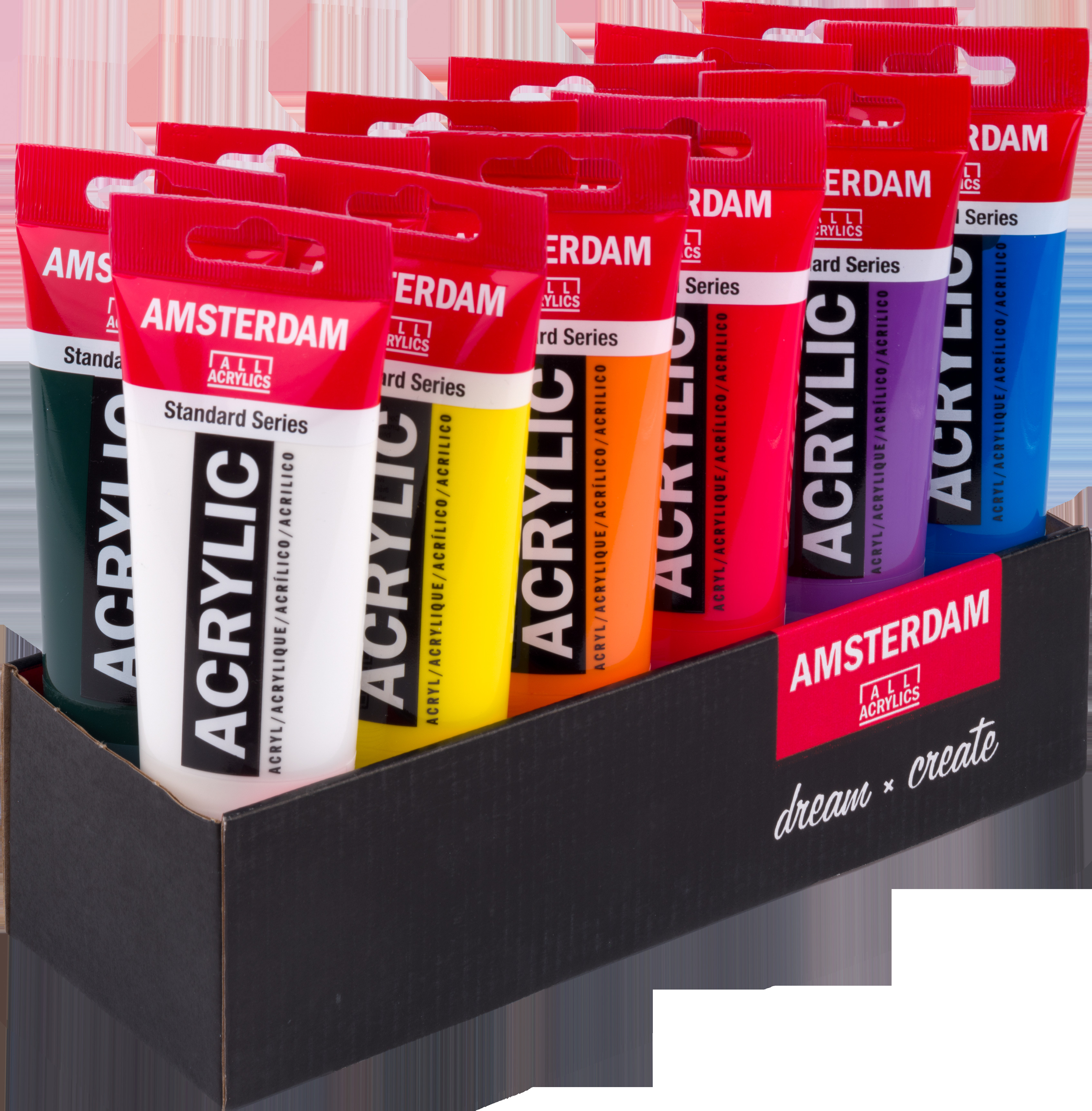 La série Amsterdam Standard ouvre un monde de couleurs vives. Leur consistance souple et polyvalente fait de la peinture un plaisir et garantit des résultats uniformes et brillants. Ce pack avantageux contient un grand choix de nos couleurs les plus populaires, avec lesquelles vous pouvez créer d'innombrables combinaisons de couleurs et des nuances individuelles. Contenu : 12 tubes de 120 ml (105 blanc titane - 275 jaune primaire - 276 orange azo - 315 rouge pyrrole - 507 violet outremer - 572 cyan primaire - 623 vert jus - 227 ocre jaune - 409 ombre brûlée - 411 terre de sienne brûlée - 718 gris chaud - 735 noir oxyde).