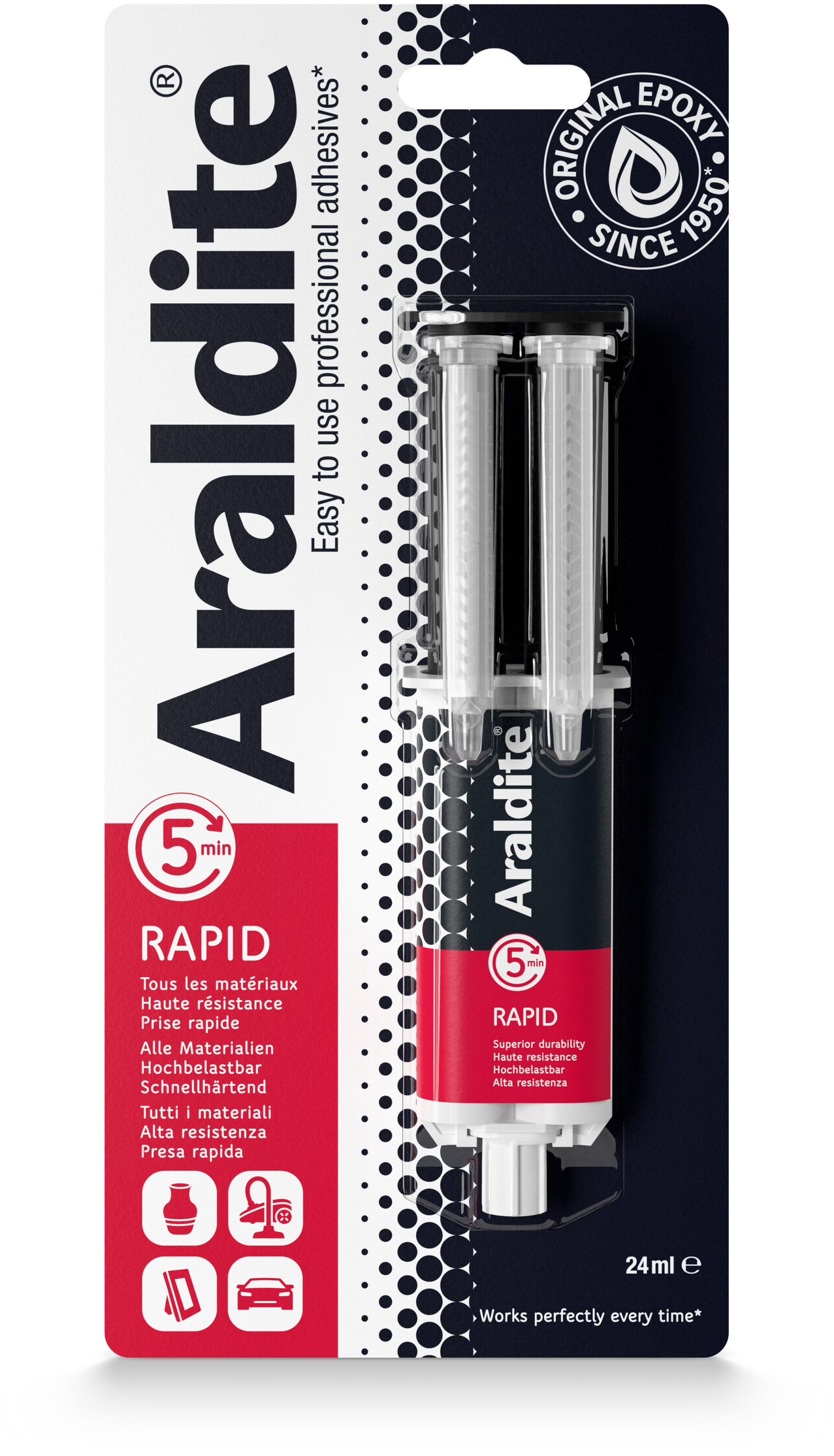 Adhésif de haute performance, sans solvant, résistant à l'eau et à long terme, pouvant être broyé et peint. Colle le métal, le bois, la maçonnerie, la céramique, le verre, le béton sec, l'aggloméré, le cuir, le carton, le tissu, le caoutchouc et la plupart des plastiques (sauf le polyéthylène, le polypropylène, le Téflon®). Assurez-vous que les surfaces sont propres et exemptes de poussière, de rouille, de saleté et de graisse. Pour une meilleure adhérence du plastique et du métal, veuillez dégraisser les surfaces avec un solvant et les rendre légèrement rugueuses avec du papier de verre. Prévoyez 2 heures pour atteindre la pleine puissance. Araldite® Rapid 2K est un adhésif fort à deux composants à durcissement rapide. Bonne résistance à l'huile, aux produits chimiques et aux chocs, résistance aux températures élevées (-30°C à 80°C).