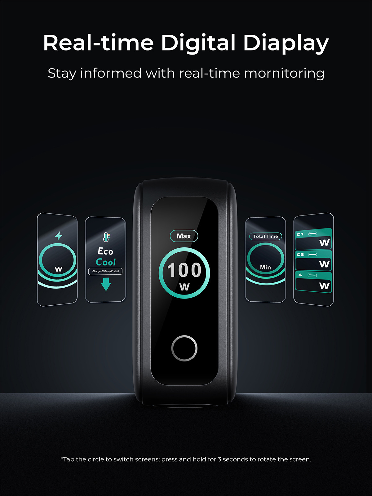 - Indicateur de charge en temps réel : L'écran intelligent HD fournit un aperçu en temps réel de l'état de charge et des données de performance des ports. En appuyant longuement, vous pouvez facilement changer l'orientation de l'écran et rester informé à tout moment des détails de la charge.