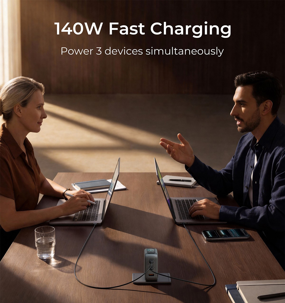 - Charge super rapide de 140 W : Fournit une puissance de sortie maximale de 140 W via un seul port USB-C-1 ou USB-C-2. Grâce au protocole PD3.1 et à la fonction de charge rapide 140 W, ce chargeur charge un MacBook Pro 16 de 0 % à 56 % en seulement 30 minutes (avec un câble USB-C d'une puissance de 140 W). Il charge les smartphones et les tablettes phares à la vitesse maximale. (Il prend en charge la dernière série d'iPhone 17 avec une charge rapide efficace de 40 W).