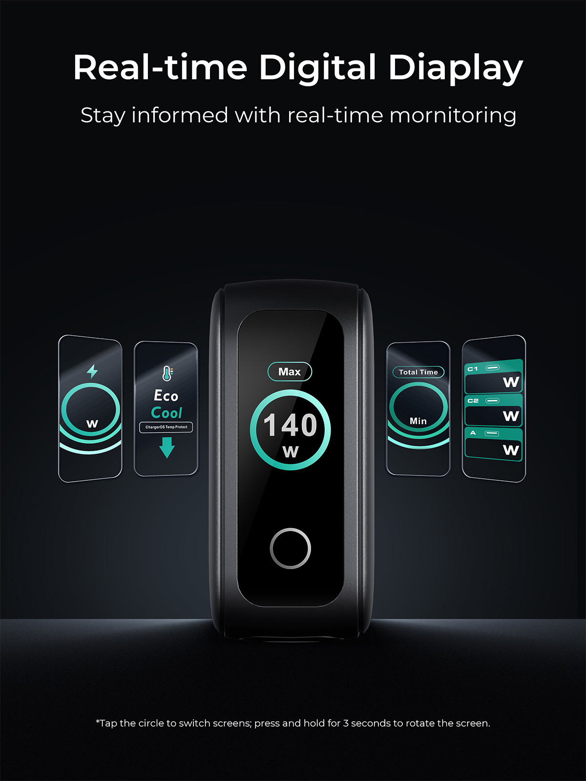 - Indicateur de charge en temps réel : l'écran intelligent HD affiche l'état de charge et les performances du port en temps réel. Une pression prolongée permet de changer l'orientation de l'écran, de sorte que vous êtes toujours informé de tous les détails de la charge.