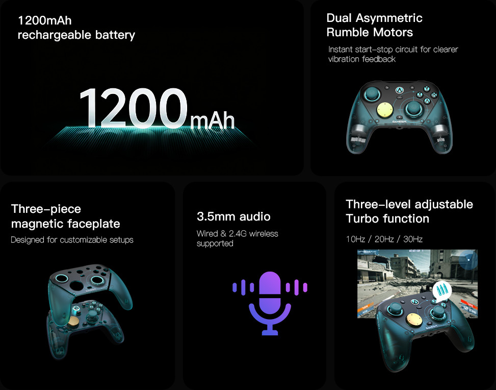 - Connexion audio de 3,5 mm. Le PC G7 Pro 8K prend en charge la sortie audio 3,5 mm via les connexions filaires et sans fil 2,4 GHz, offrant ainsi une expérience de jeu plus confortable et plus immersive.