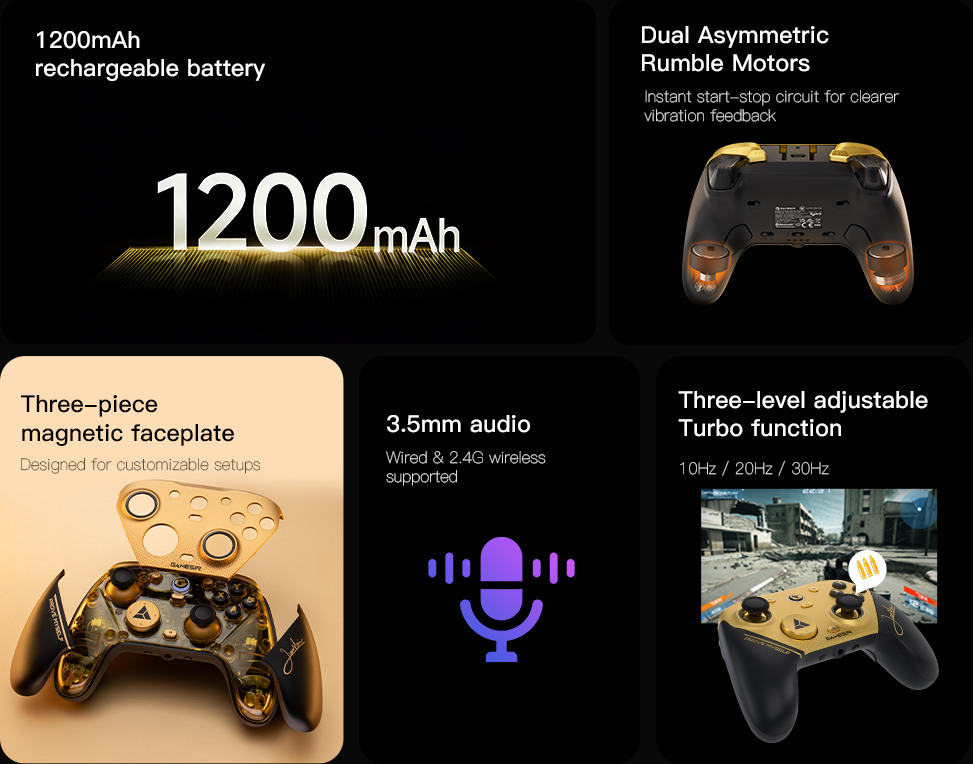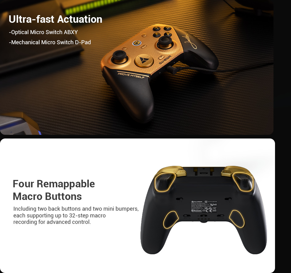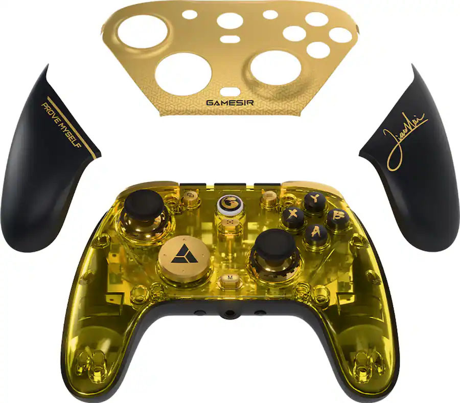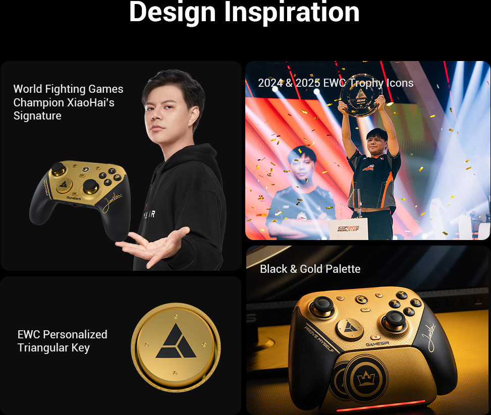 - Champion Edition - Inspirée par le champion du monde de combat XiaoHai. Cette édition, inspirée par notre ambassadeur de marque et champion du monde de jeu de combat XiaoHai, se distingue par son design noir et or. La station de recharge présente les symboles des trophées EWC de 2024 et 2025, tandis que la signature de XiaoHai orne la poignée droite. Le D-Pad est imprimé avec le bouton triangulaire personnalisé EWC - un design fait pour les champions.