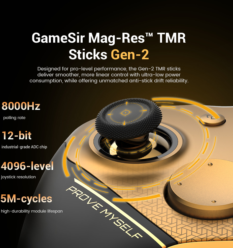 - GameSir Mag-Res™ TMR Sticks Gen-2. Conçus pour des performances professionnelles, les sticks Gen-2 TMR continuent d'utiliser la technologie magnétique pour éviter tout contact physique. Cela garantit une fiabilité durable sans dérive du stick. En même temps, ils offrent un contrôle plus fluide et plus linéaire et une consommation d'énergie extrêmement faible pour un gameplay précis et réactif.