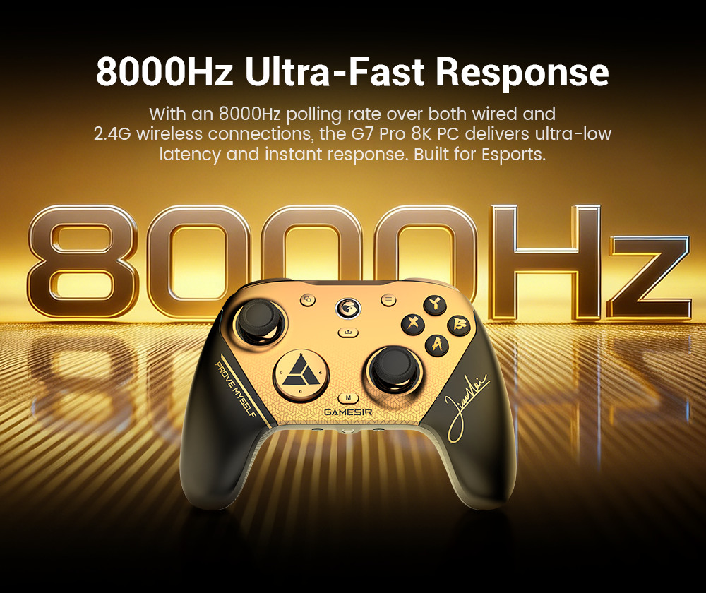 Née pour l'e-sport. Conçue pour les performances maximales. Découvrez le G7 Pro 8K PC, une manette e-sport sans fil spécialement conçue pour le jeu compétitif sur PC. Grâce au balayage ultrarapide de 8K Hz (filaire) et à la transmission sans fil de 2,4 GHz, chaque mouvement est capturé avec une rapidité et une précision fulgurantes, pour un véritable avantage compétitif. Maintenant dans l'édition Champion, inspirée par notre ambassadeur de marque XiaoHai, un champion du monde de jeu de combat. Avec le G7 Pro 8K PC, ressentez la puissance d'un véritable champion.