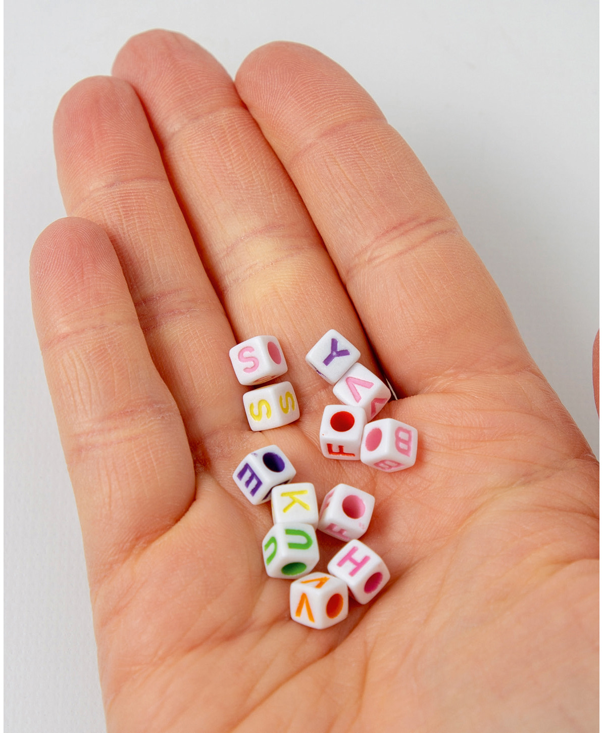 Perles pour bijoux, lettres, carrées, blanches/multicolores, 6 mm, 50 gr.