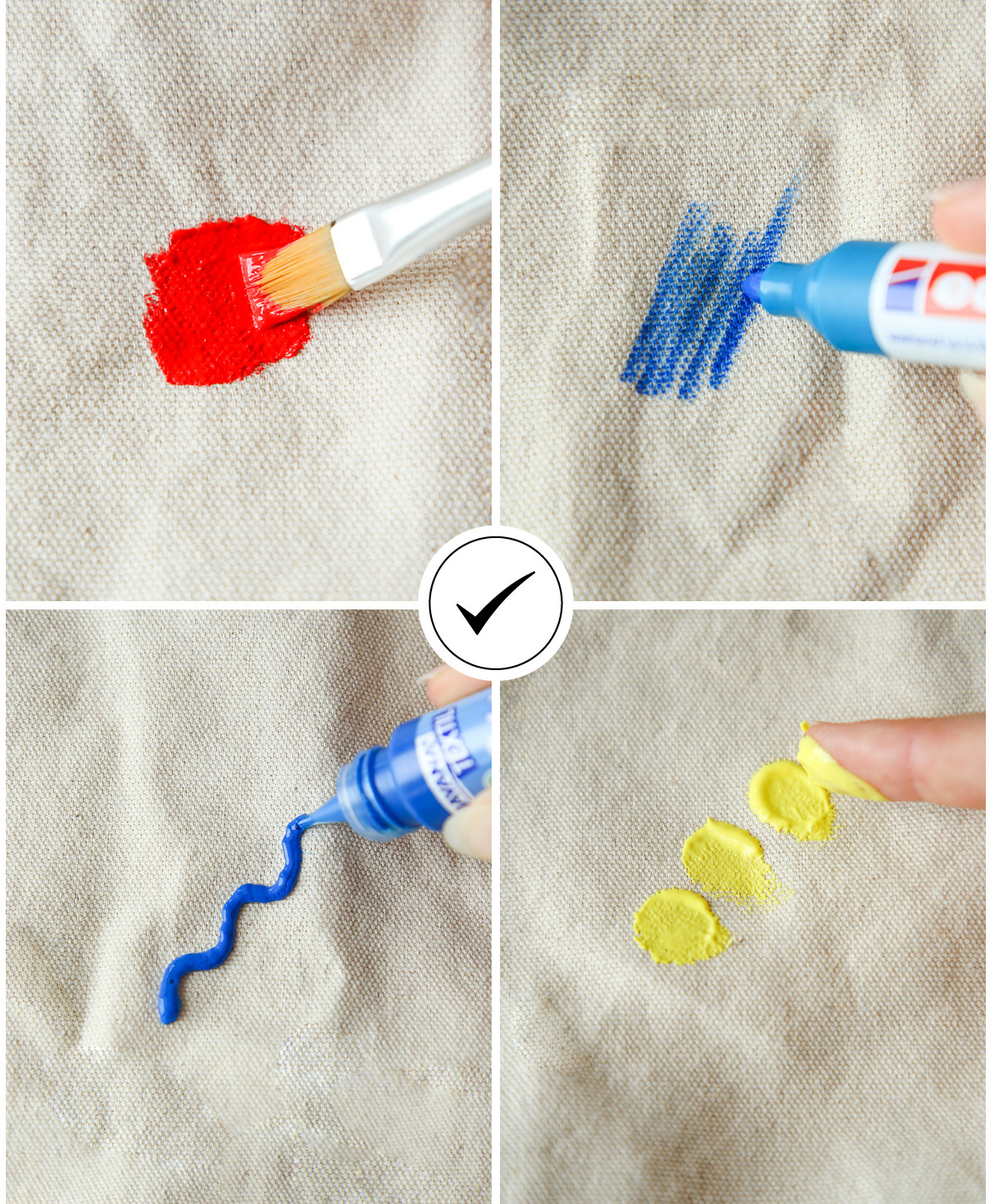 Les textiles permettent de réaliser de nombreuses et magnifiques idées créatives. Que l'on imprime le tissu avec un tampon fait maison, que l'on laisse les petits enfants peindre avec de la peinture pour textile, que l'on y appose de belles inscriptions ou que l'on décore avec d'autres matériaux, les résultats sont à chaque fois convaincants. Les tote bags très tendance doivent leur nom au mot anglais "to tote" qui signifie porter. Les sacs en tissu sont pratiques, légers et durables. Joliment décorés ou portant des inscriptions, ils deviennent de parfaits accessoires de mode. Avant d'appliquer la première couche de peinture, les textiles doivent être prélavés sans adoucissant afin que la peinture adhère bien. La plupart des couleurs de tissu doivent être fixées avec précaution au fer à repasser après le séchage de l'envers. Pour cela, veuillez suivre les indications figurant sur les crayons et les couleurs.