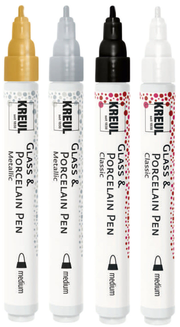 Crayons de peinture pour verre et porcelaine brillants à base d'eau - semi-couvrants, résistants à la lumière - Pour peindre la porcelaine, le verre, le métal, la céramique émaillée - Sans secouer ni pomper - Avec une pointe de pinceau élastique pour une écriture et une peinture fines et larges ainsi que pour des décorations pleines d'élan - Après un temps de séchage de 4 heures, ils peuvent être cuits pendant 90 minutes à 160 °C dans un four non préchauffé - Après la cuisson, la peinture est résistante à l'eau et convient au lave-vaisselleContenu :4x crayons de peinture pour verre et porcelaine medium : blanc, noir, or, argent