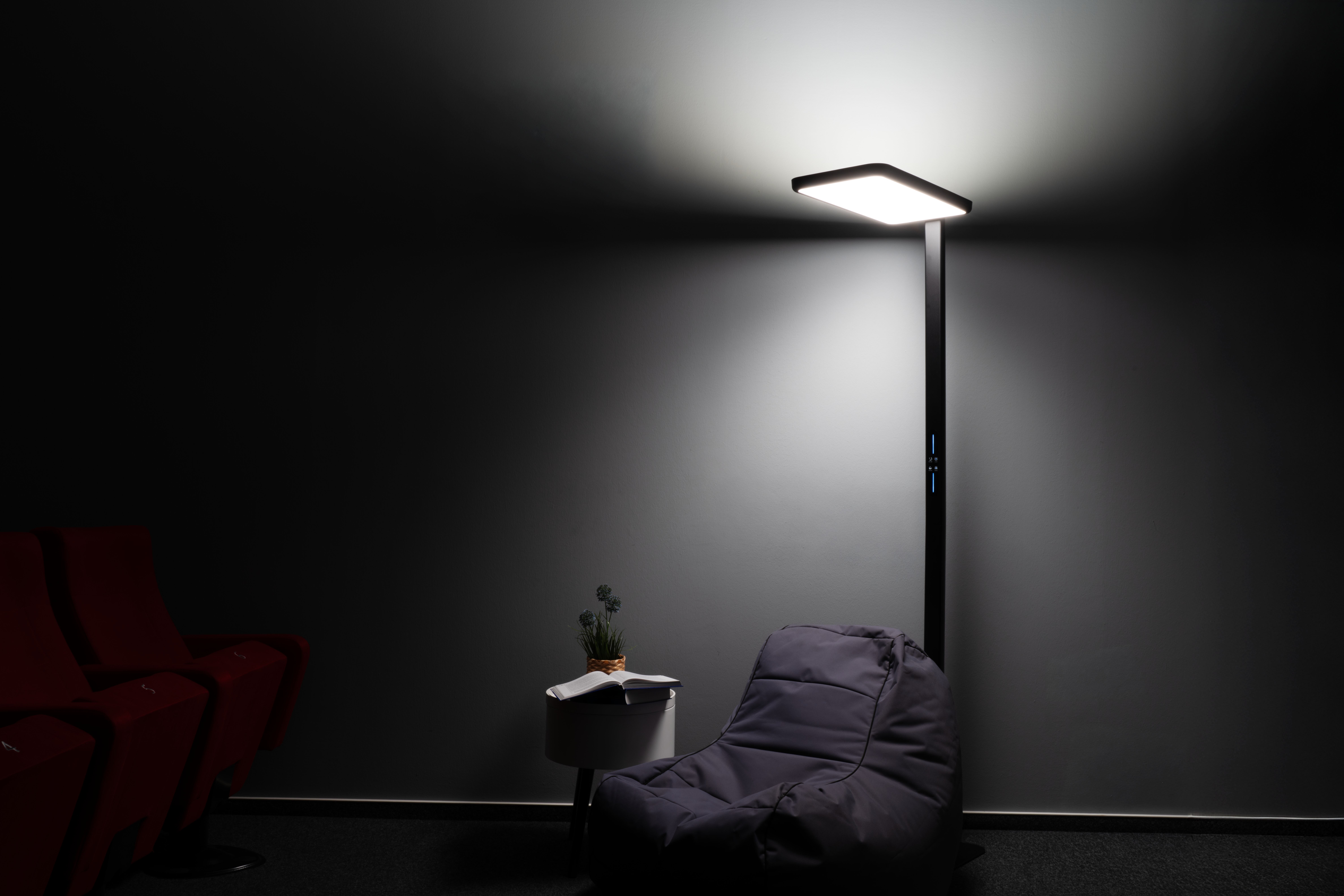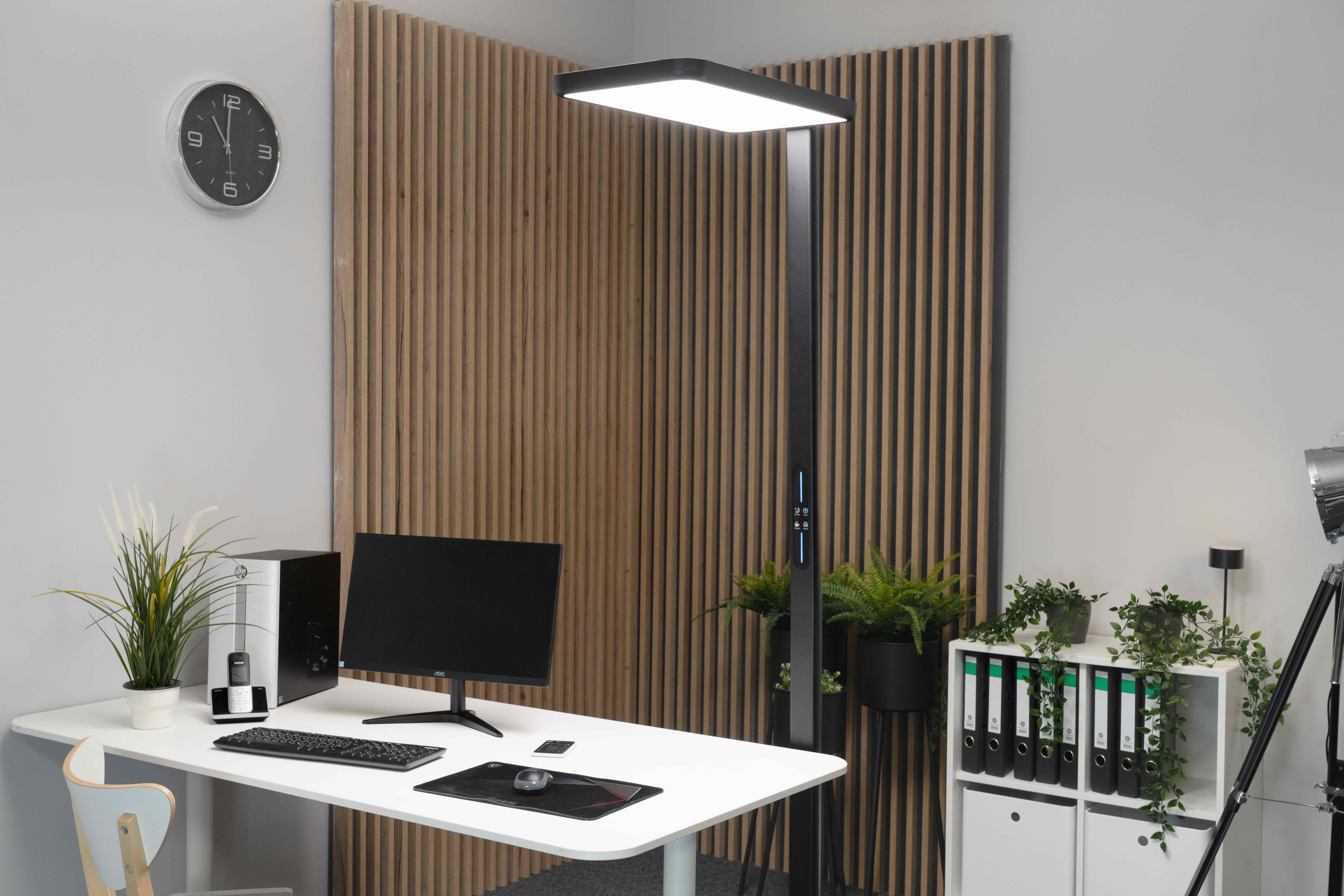 Lampadaire LED LUXULA - une lumière puissante et stylée pour le bureau et la maison. Le lampadaire LED LUXULA allie un design moderne à une puissance lumineuse impressionnante : 100 W de puissance totale (up- &amp; downlight 50 W chacun) fournissent 7.000 lumens pour un éclairage uniforme et sans éblouissement. Avec CRI 98, UGR 16 et une protection oculaire certifiée RG0, il assure une lumière naturelle qui ménage les yeux - idéal pour le bureau, le home office ou le salon. Le panneau tactile permet de régler la luminosité en continu, trois modes offrent une flexibilité adaptée à chaque situation : mode nuit - une lumière douce pour des heures de calme, mode détente - une lumière chaude pour se déconnecter, mode lecture - une lumière focalisée pour une concentration totale. Avec des LED Bridgelux, un bloc d'alimentation Eaglerise et un angle de rayonnement de 90°, la lampe convainc par son efficacité, sa longévité et sa répartition uniforme de la lumière.<br>
