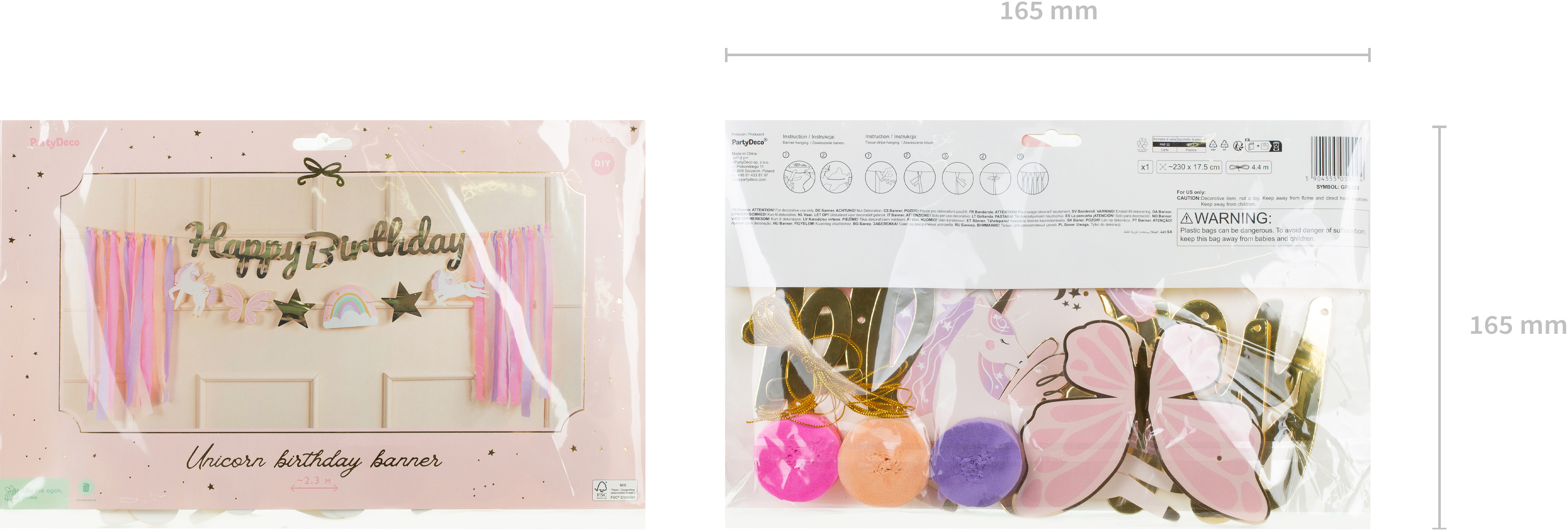 Bannière Happy Birthday Licornes, en papier avec rubans, couleurs mélangées, dimensions env. 230 x 17.5, longueur du cordon env. 4.4 m. Produit à monter soi-même.