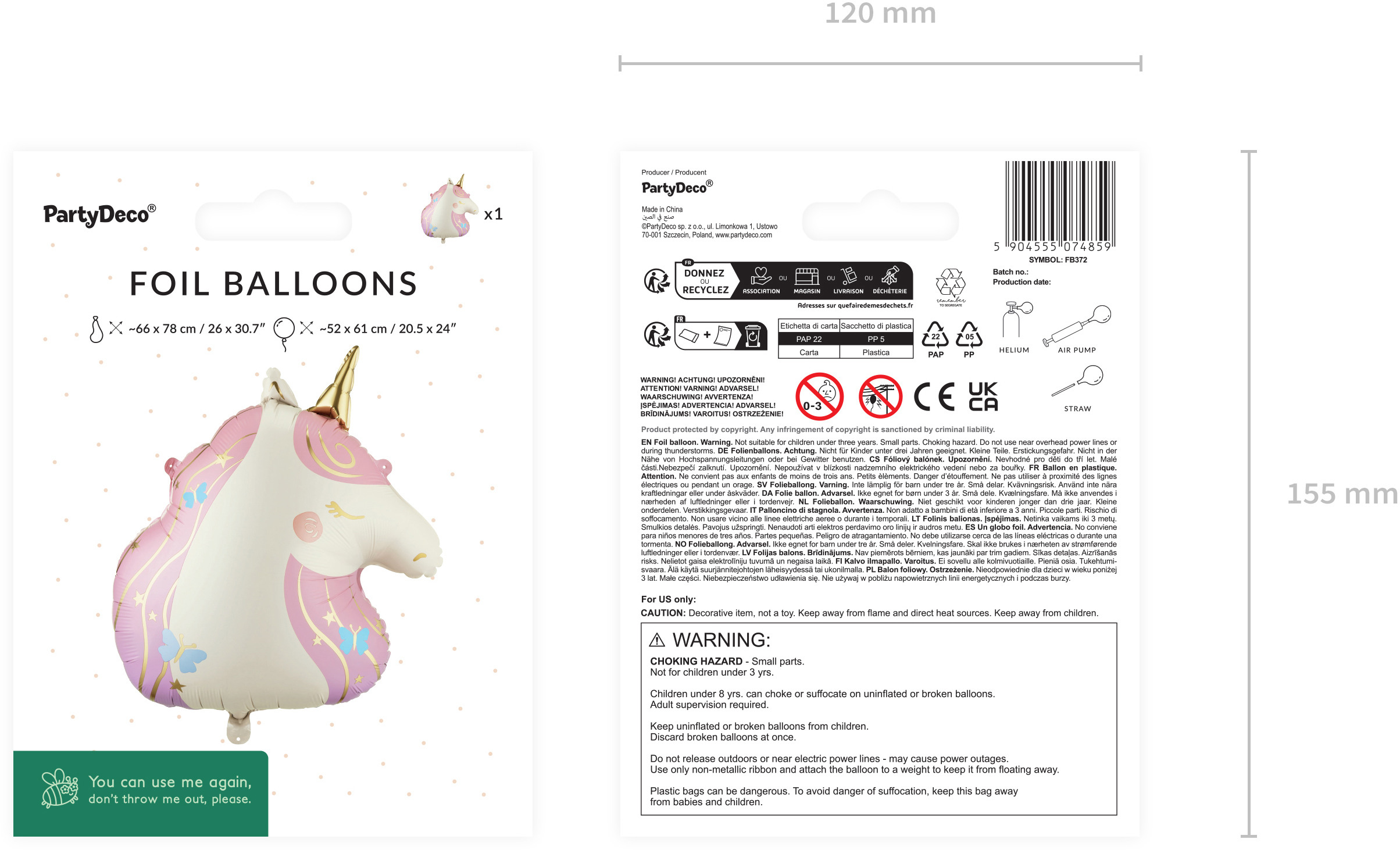 Ballon en plastique Licorne, en crème-rose avec des accents dorés. Dimensions avant le gonflage : env. 66 x 78 cm (26,0 x 30,7''), dimensions après le gonflage : env. 52 x 61 cm (20,5 x 24,0''). Convient au gonflage à l'air et à l'hélium. Le set contient une paille.