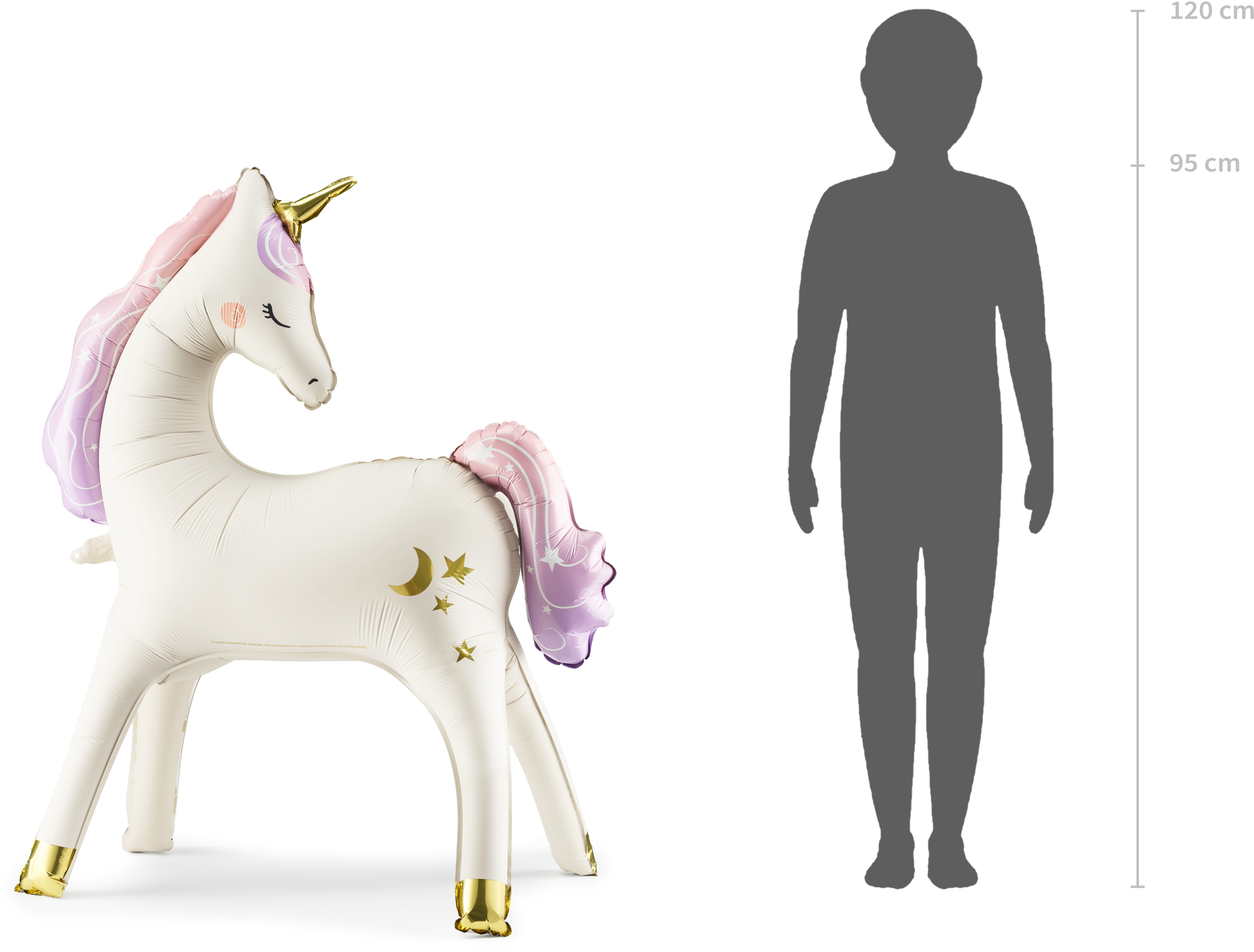 Ballon en plastique debout Licorne en beige avec des éléments dorés et arc-en-ciel. Avant le gonflage : 104 x 117 cm, après : 95 x 86 cm. Ne peut être gonflé qu'à l'air.
