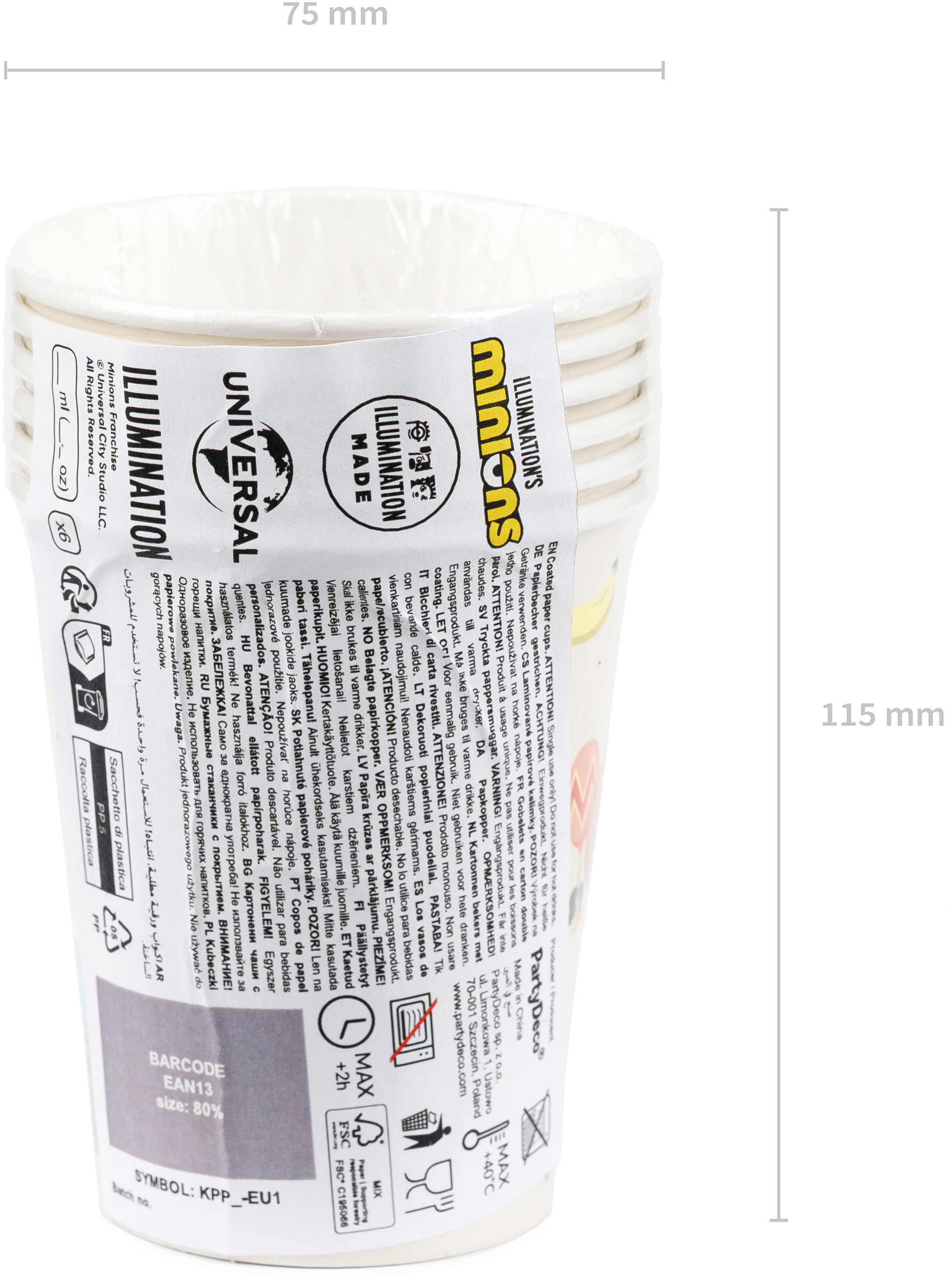 Gobelet en papier beige avec impression Minions. Hauteur env. 9 cm, capacité env. 250 ml (8,5 oz). Produit à usage unique. Ne pas utiliser pour les boissons chaudes. Gobelet étiqueté conformément au règlement d'exécution (UE) 2020/2151 de la Commission. Produit avec étiquette uniquement en polonais, allemand, tchèque, français, néerlandais, slovaque, slovène et bulgare.(1 UE / 6 pcs.)