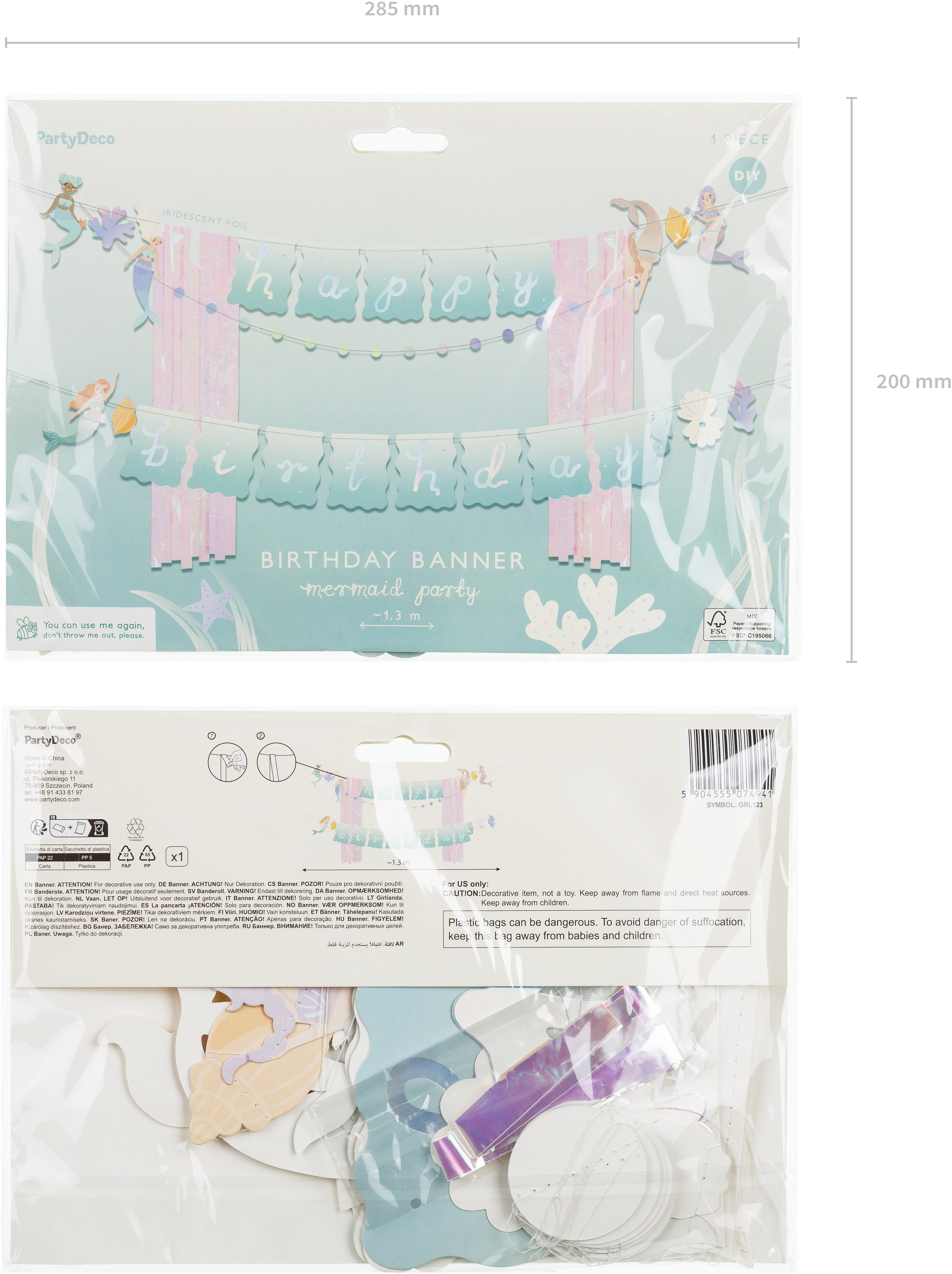 Bannière Joyeux anniversaire sirène, en papier, couleurs mix, dimensions env. 130 x 100 cm, longueur de la ficelle env. 4,3 m. Produit à monter soi-même.