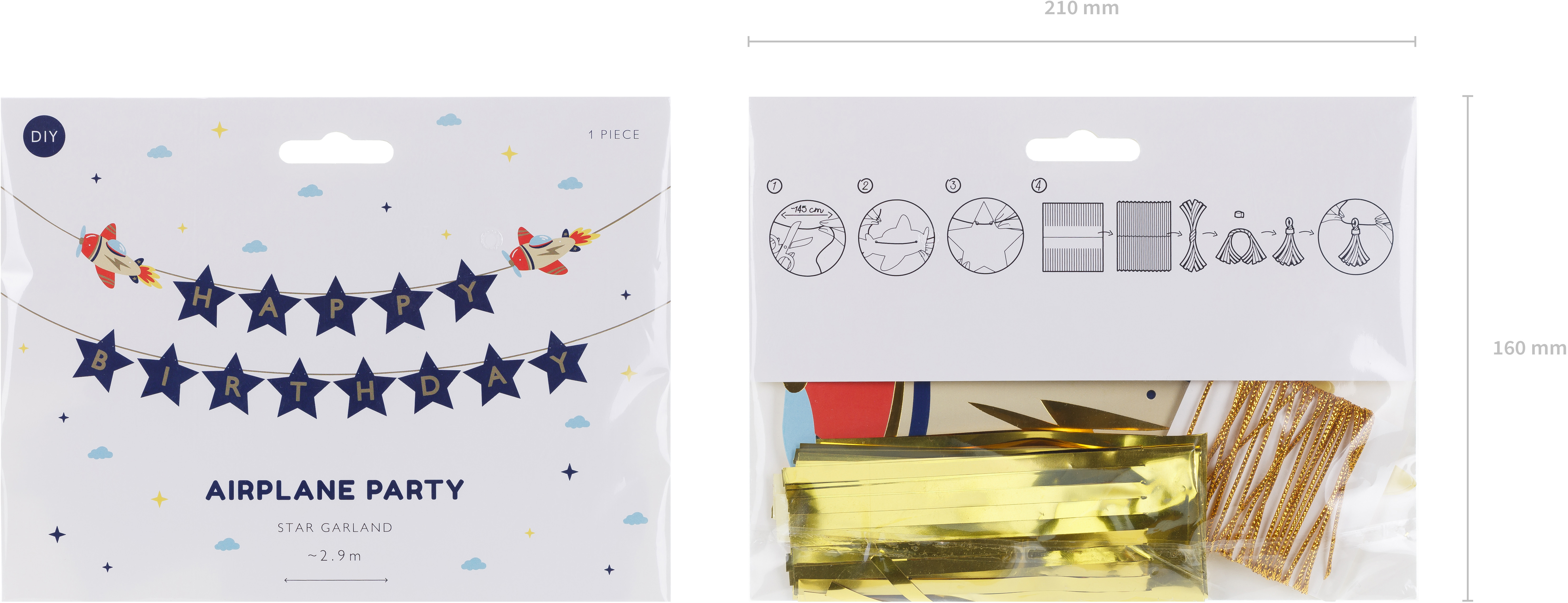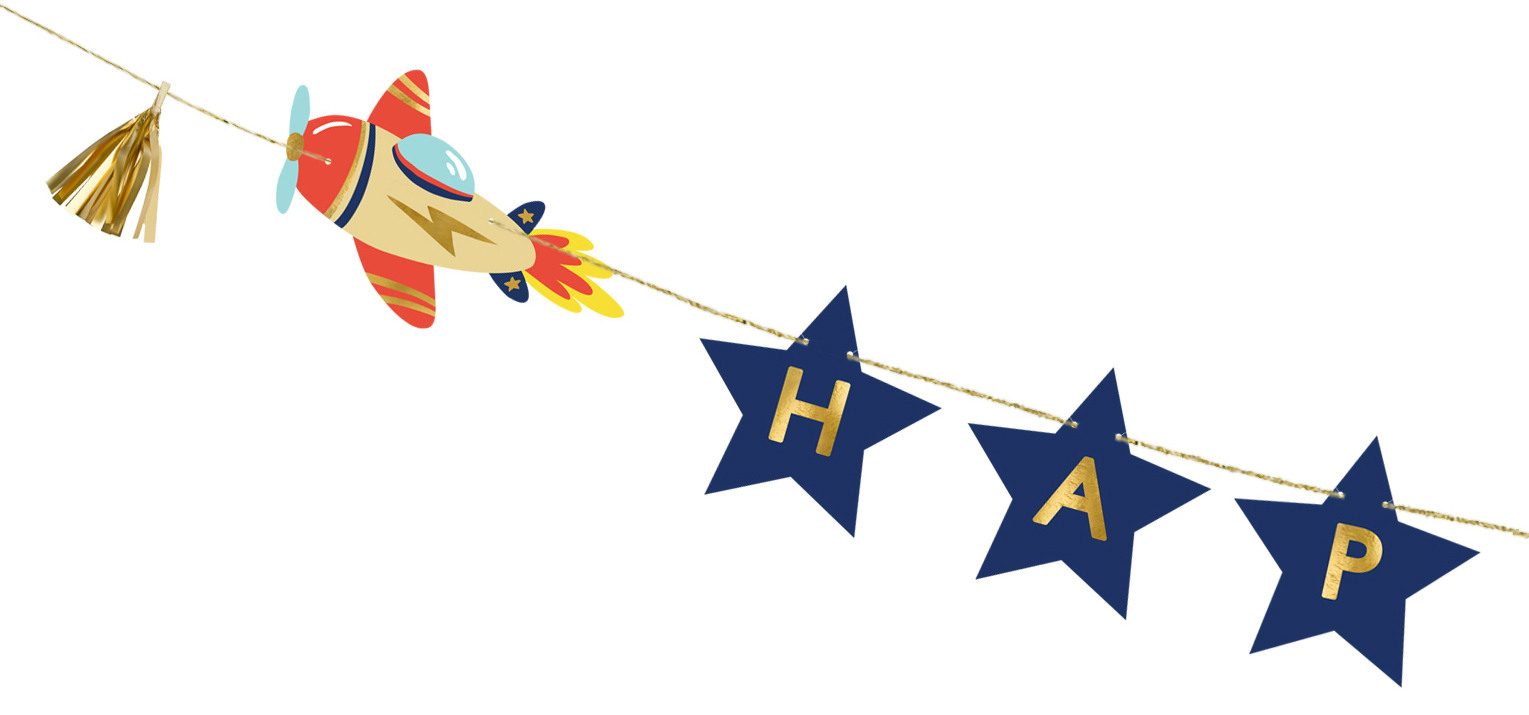 Bannière Avions avec inscription Happy Birthday en papier avec deux glands dorés, mélange de couleurs. Hauteur env. 13 cm, longueur du cordon env. 3 m. Produit DIY.