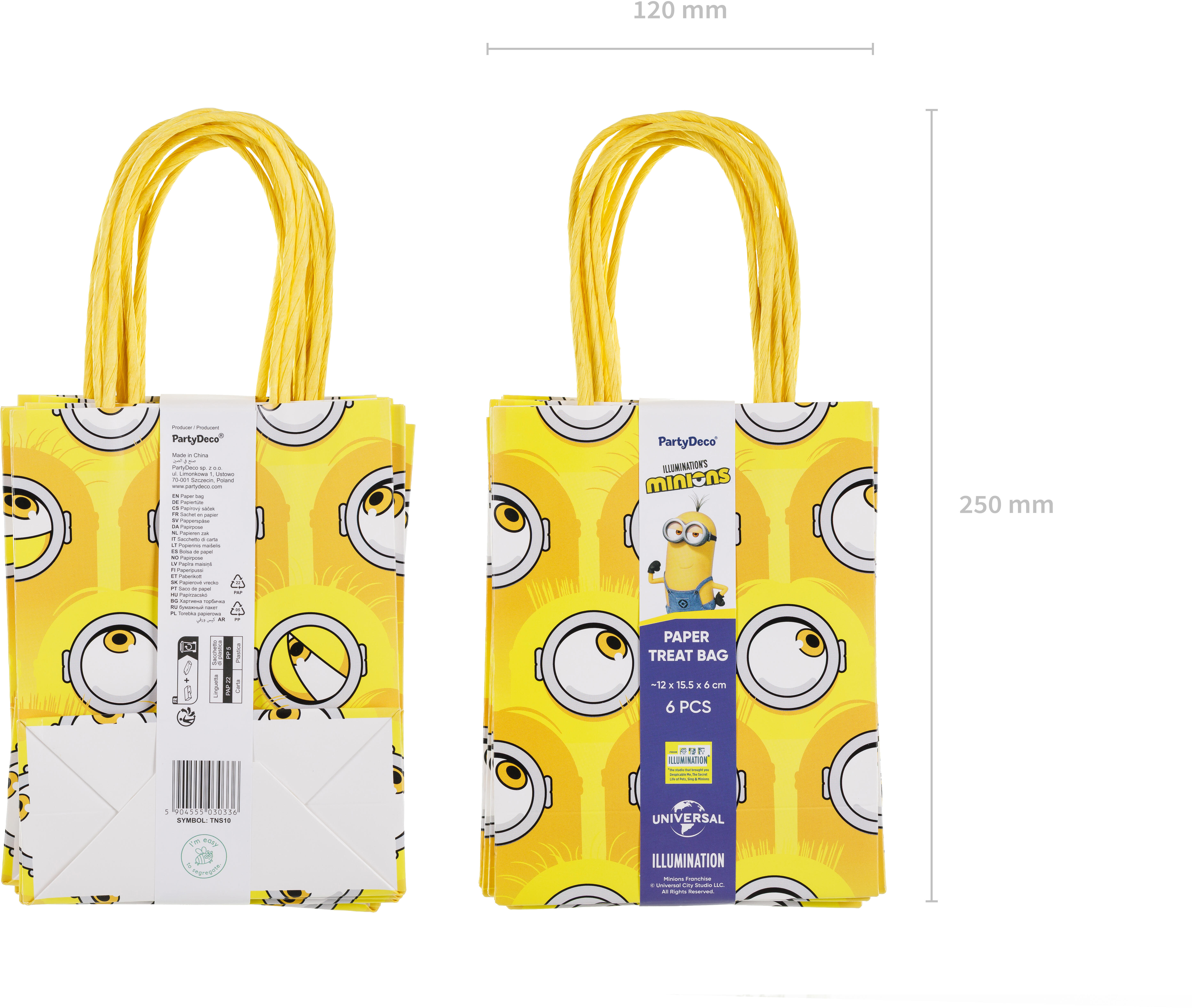 Sacs cadeaux en papier pour cadeaux ou friandises Minions en jaune avec impression. Dimensions 12 x 15.5 x 6 cm. En set de 6 pièces dans un design.(1 UE / 6 pcs.)