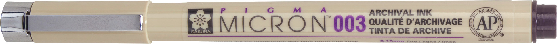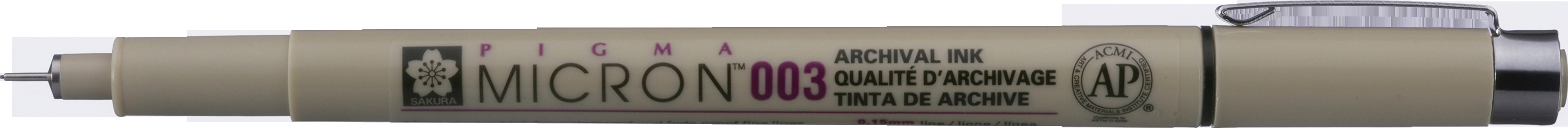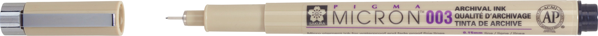 Die Pigma Micron Stifte sind wasserfeste und permanente Fineliner, die gerne von Designern, Wissenschaftlern, Archivaren, Architekten, Manga-Zeichnern, Cartoonisten, Illustratoren und Hobbykünstlern verwendet werden. Dank der feinen Spitze ist dieser Stift ideal für sowohl technische als auch künstlerische Zeichnungen. Die Fineliner haben eine verlängerte Spitze, die mit einer schützenden Metallhülse ausgestattet ist. Das sorgt für zusätzliche Kontrolle und höhere Belastbarkeit bei der Verwendung mit Zeichengeräten wie Linealen.<br>Der Pigma Micron ist der erste technische Einwegstift mit pigmentierter Archivtinte. Verschmiert nicht, verwischt nicht und läuft auf den meisten Papieren nicht aus.<br> <br>Eigenschaften<br>Wird von technischen Fachleuten wie Anthropologen, Entomologen, Wissenschaftlern, Ingenieuren, Archivaren, Architekten und in Forschungslabors verwendet.<br>Verschmiert nicht, verwischt nicht und läuft auf den meisten Papieren nicht aus.<br>Permanente und archivierbare Qualitätstinte.<br>Wasserfest und lichtecht.<br>Wasserbasierte Formulierung von Tinte auf Pigmentbasis, komplexer und stabiler als Tinte auf Farbstoffbasis.<br><br> <br>Technische Daten<br>Arbeitstemp.: 5˚C - 40˚C<br>Art der Tinte: Pigmenttinte auf Wasserbasis<br>Strichstärke: 0,15 mm<br>Grösse: 135 mm<br>