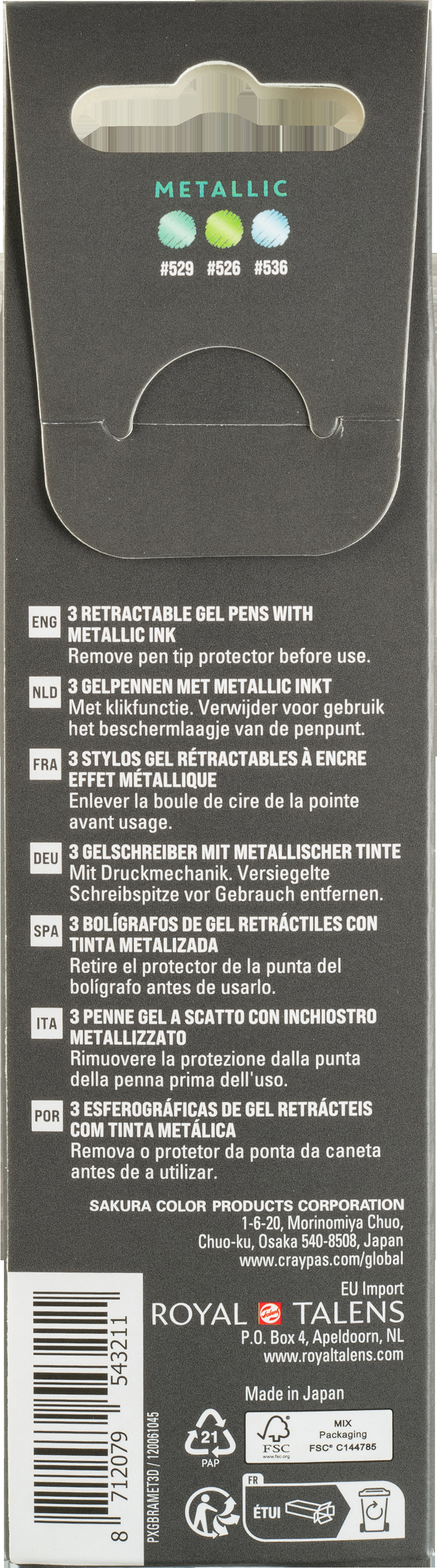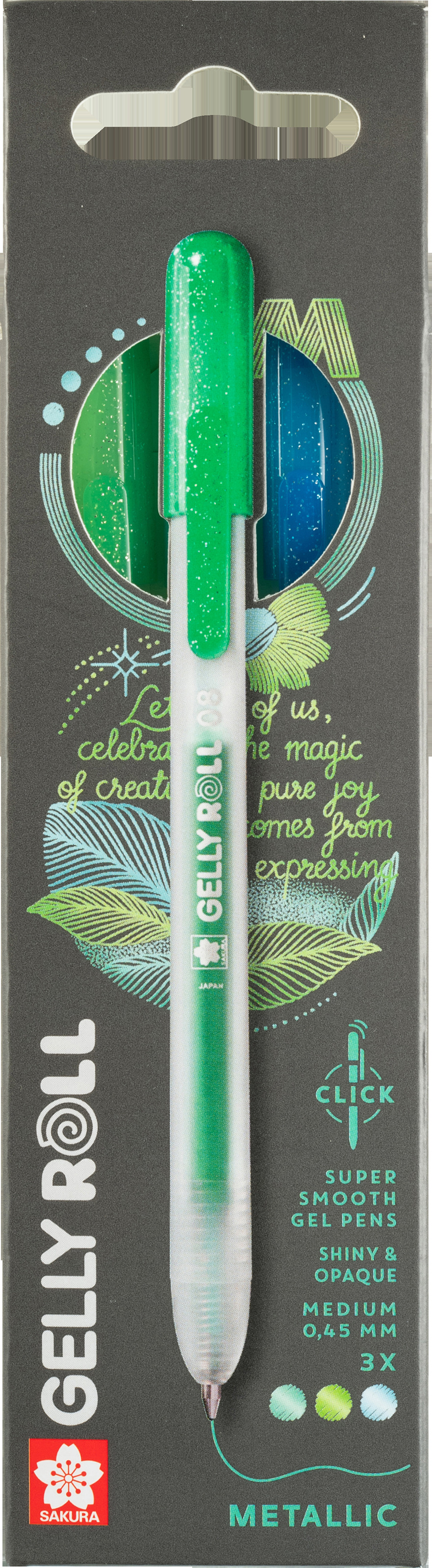 Erleben Sie lebendige Farben und geschmeidiges Schreiben mit dem Gelly Roll Retractable. Die glänzende Metallic-Geltinte sorgt für satte, deckende Linien auf hellen wie dunklen Untergründen – perfekt für kreative Projekte, Journaling oder Notizen.<br>Dank der einziehbaren Spitze ist der Stift sofort einsatzbereit, ganz ohne Kappe. Die schnelltrocknende Tinte minimiert Verschmieren, während die Präzisionsspitze klare, saubere Linien liefert. Dieses Set enthält drei Metallic-Gelstifte in den Farben Blau, Grün und Smaragd.