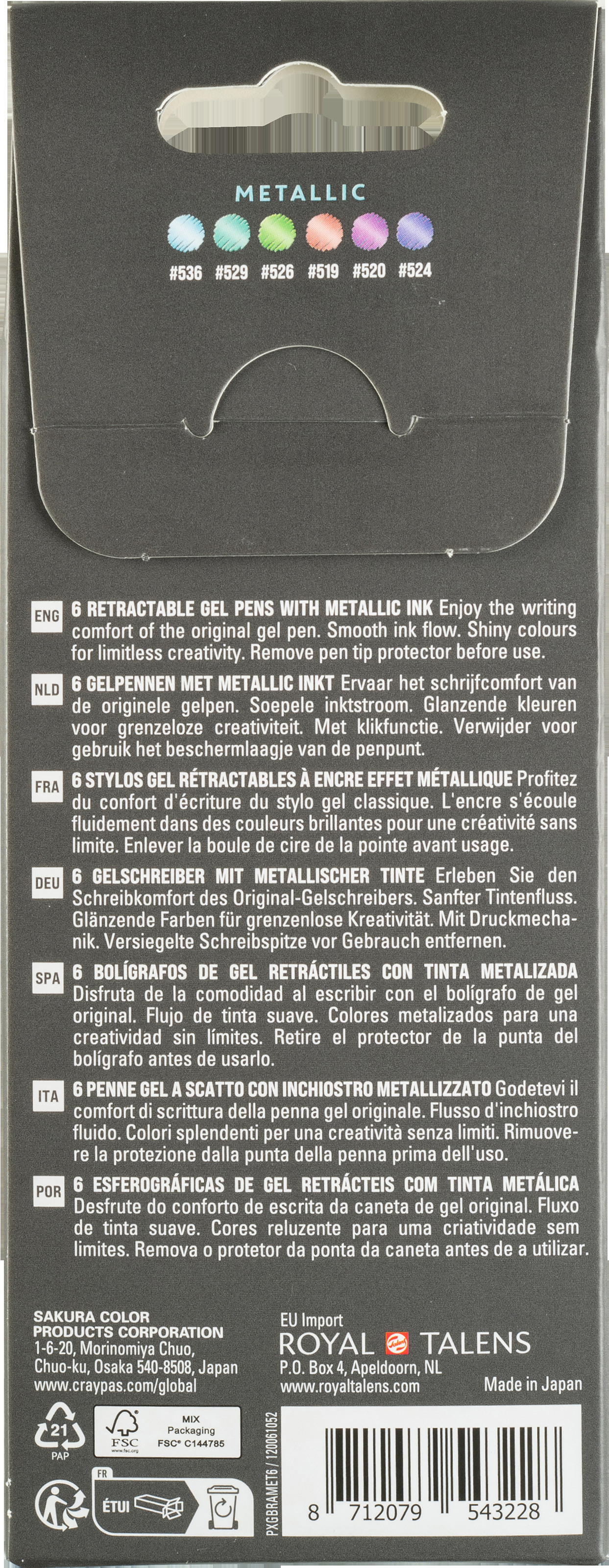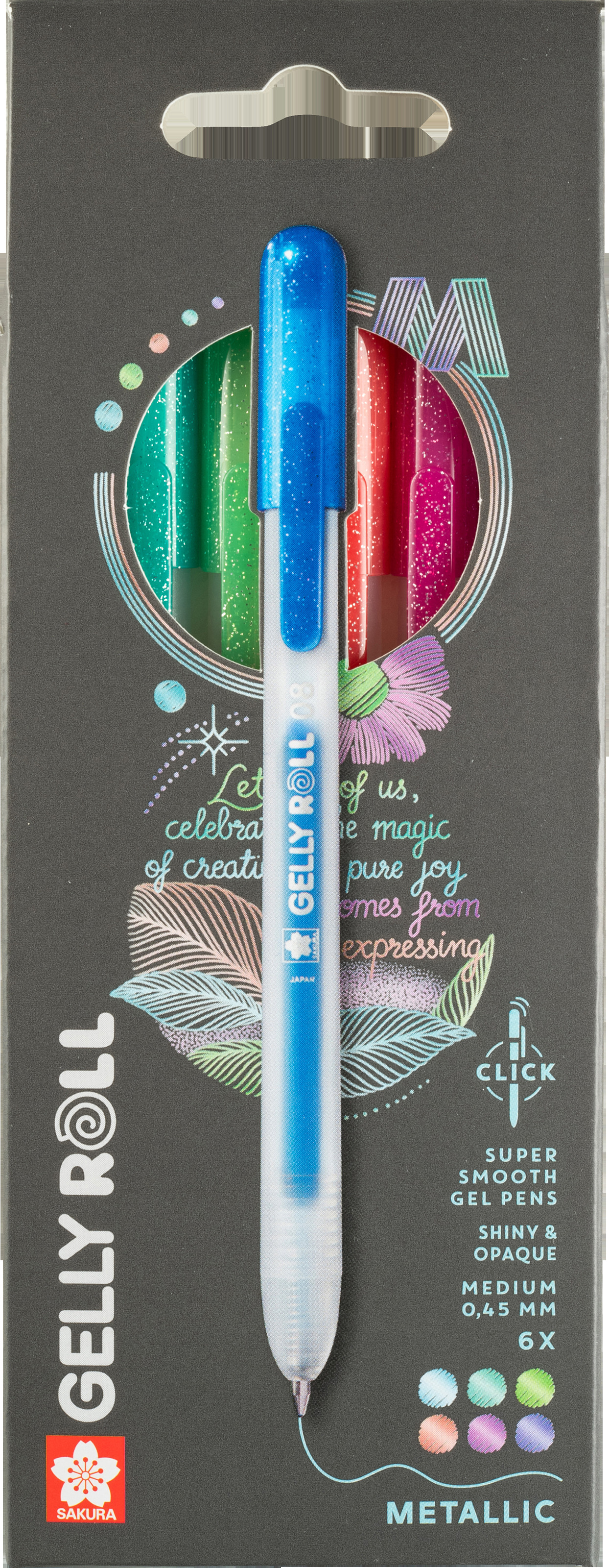 Erleben Sie lebendige Farben und geschmeidiges Schreiben mit dem Gelly Roll Retractable. Die glänzende Metallic-Geltinte sorgt für satte, deckende Linien auf hellen wie dunklen Untergründen – perfekt für kreative Projekte, Journaling oder Notizen.<br>Dank der einziehbaren Spitze ist der Stift sofort einsatzbereit, ganz ohne Kappe. Die schnelltrocknende Tinte minimiert Verschmieren, während die Präzisionsspitze klare, saubere Linien liefert. Dieses Set enthält sechs Metallic-Gelstifte in den Farben Blau, Grün, Smaragd, Rot, Pink und Lila.