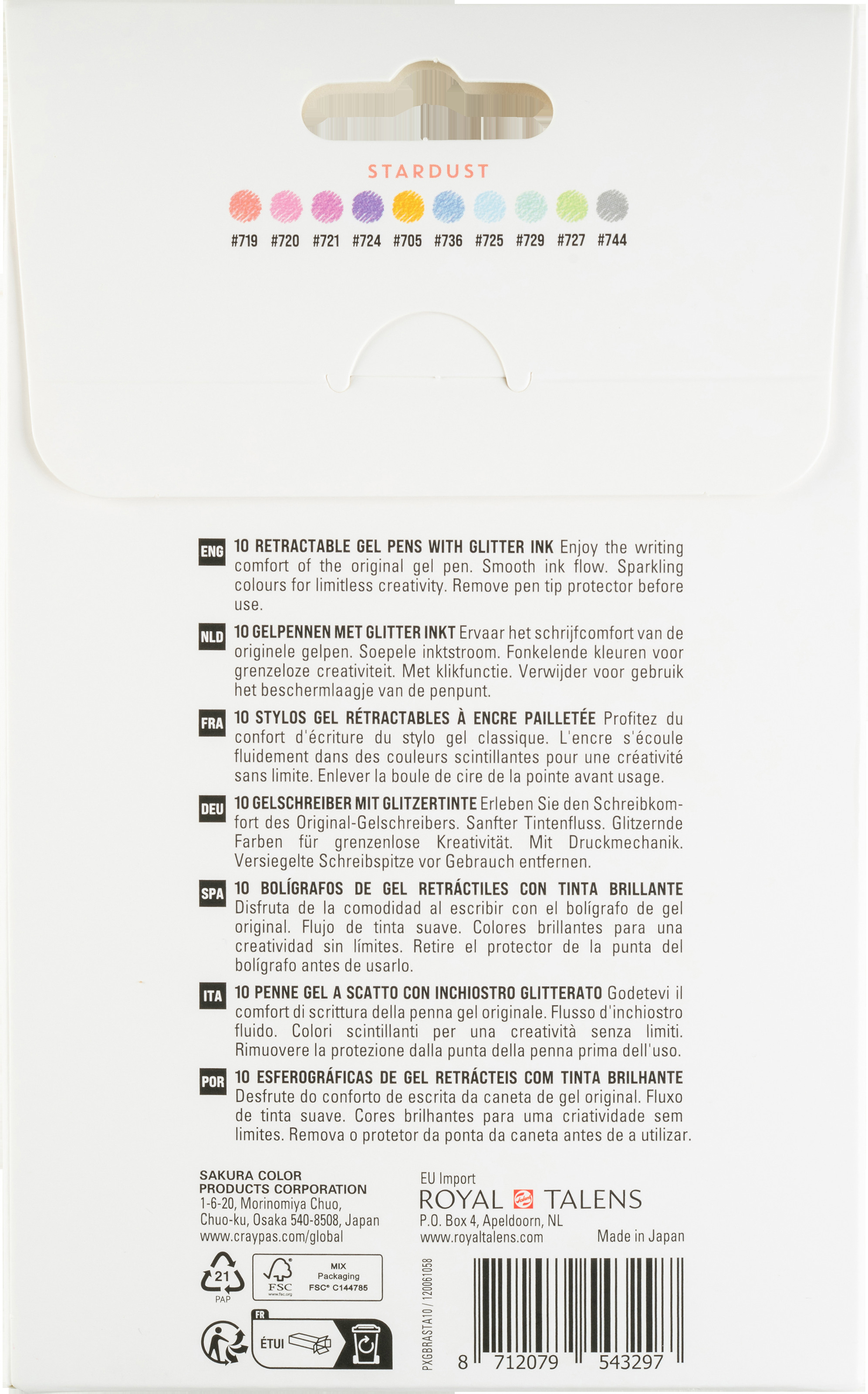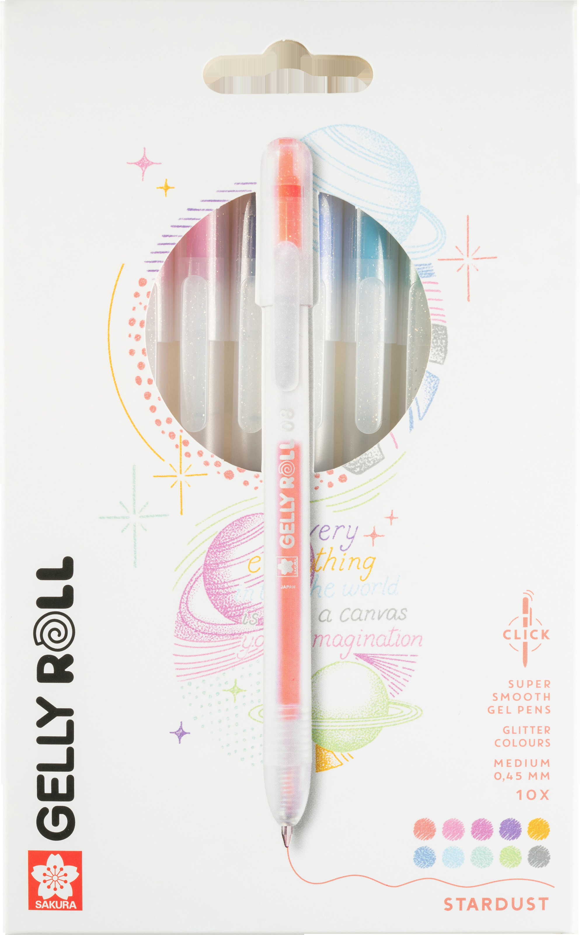 Gelly Roll Stardust verfügt über eine glitzernde Geltinte, die schnell trocknet und einen atemberaubenden Farbeffekt bietet, der das Licht reflektiert und ungleichmässig wie kleine Sterne funkelt. Ob Sie Tagebuch schreiben, kritzeln oder ein kreatives Kunstprojekt starten, Sie können sich auf die Präzisionsspitze des Stifts verlassen, um scharfe, saubere Linien zu erzeugen. Dieses Set besteht aus 10 Gelstiften mit Druckmechanik und glitzernder Tinte in den Farben Sternenstaub-Orange, Rot, Rosa, Pink, Lila, Blau, Himmelblau, Grün, Smaragdgrün und Silber.