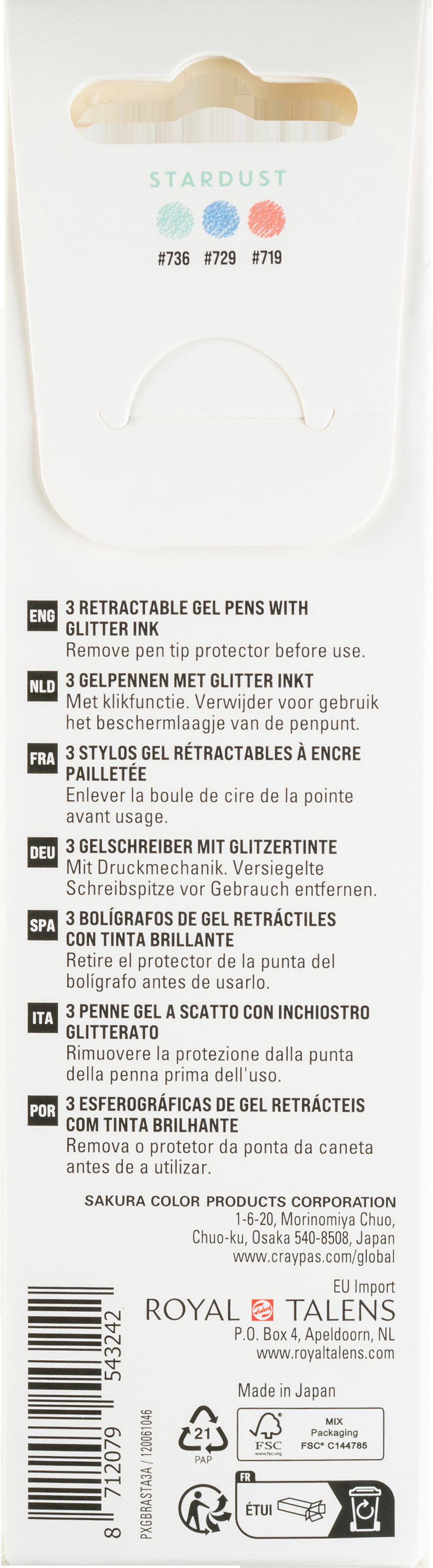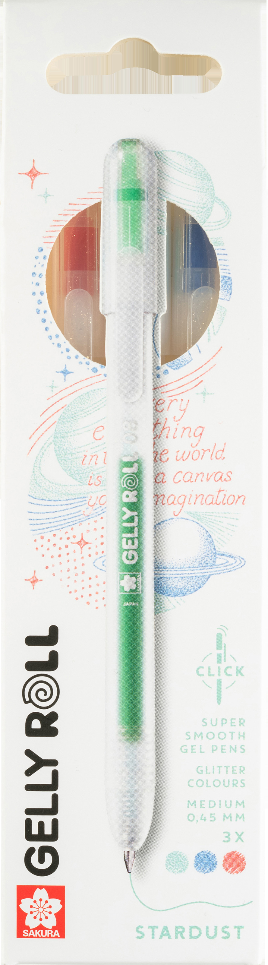 Gelly Roll Stardust verfügt über eine glitzernde Geltinte, die schnell trocknet und einen atemberaubenden Farbeffekt bietet, der das Licht reflektiert und ungleichmässig wie kleine Sterne funkelt. Ob Sie Tagebuch schreiben, kritzeln oder ein kreatives Kunstprojekt starten, Sie können sich auf die Präzisionsspitze des Stifts verlassen, um scharfe, saubere Linien zu erzeugen. Dieses Set besteht aus 3 Gelstiften mit Druckmechanik und glitzernder Tinte in den Farben Rot-Blau-Grün.