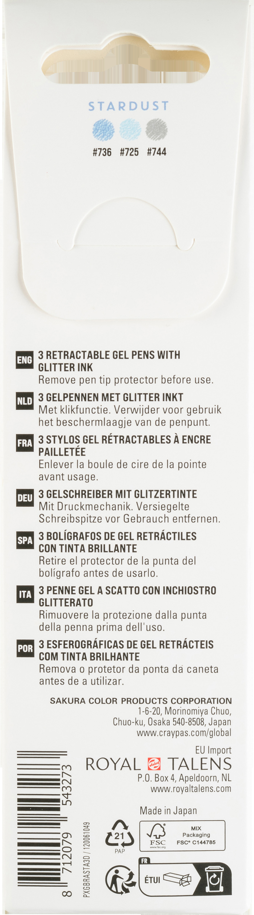 Gelly Roll Stardust verfügt über eine glitzernde Geltinte, die schnell trocknet und einen atemberaubenden Farbeffekt bietet, der das Licht reflektiert und ungleichmässig wie kleine Sterne funkelt. Ob Sie Tagebuch schreiben, kritzeln oder ein kreatives Kunstprojekt starten, Sie können sich auf die Präzisionsspitze des Stifts verlassen, um scharfe, saubere Linien zu erzeugen. Dieses Set besteht aus 3 Gelstiften mit Druckmechanik und glitzernder Tinte in den Farben Blau-Himmelblau-Silber.