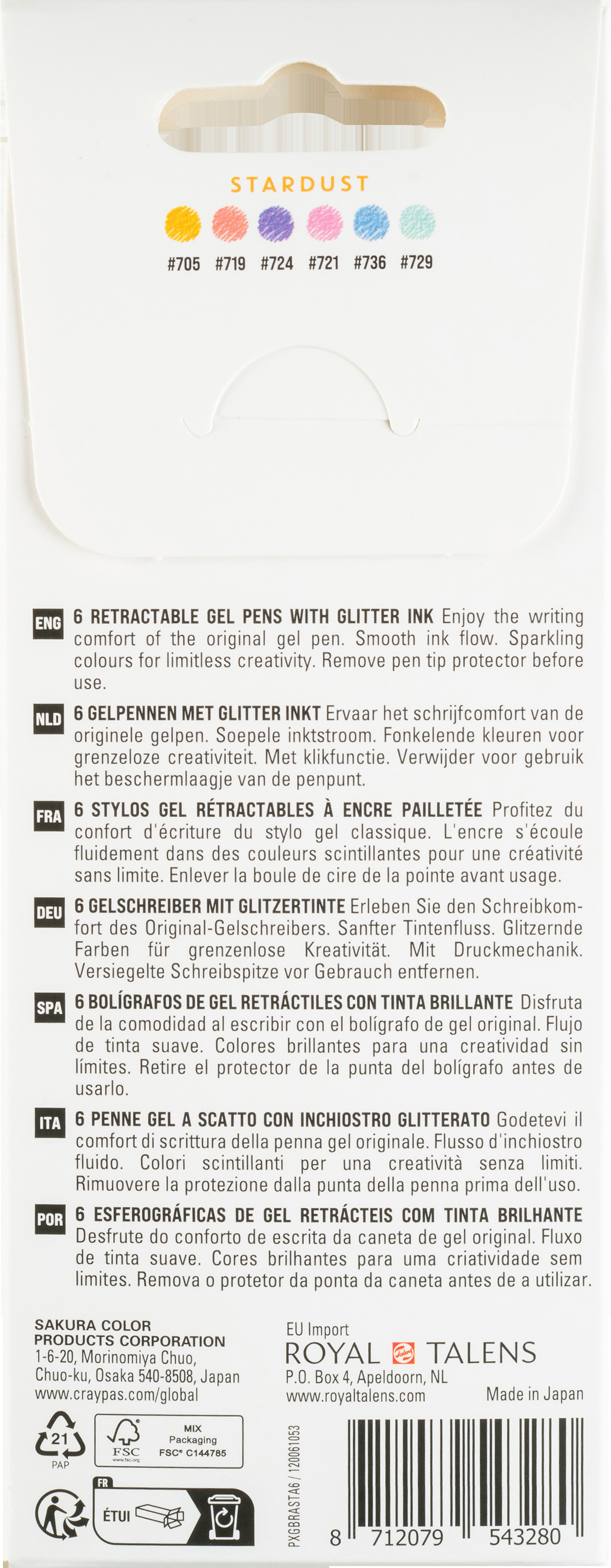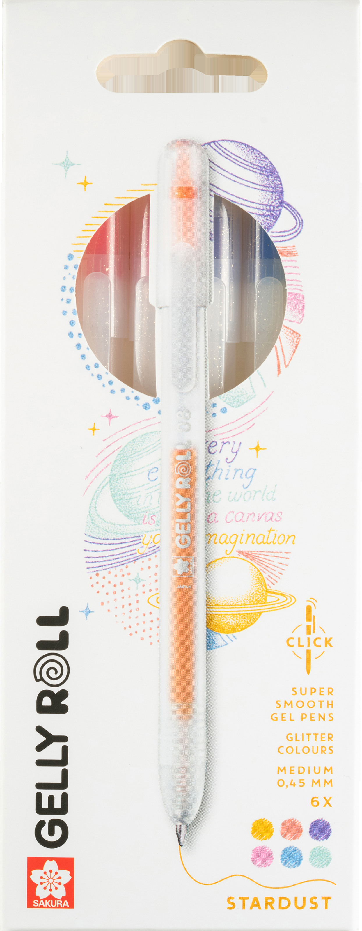 Gelly Roll Stardust verfügt über eine glitzernde Geltinte, die schnell trocknet und einen atemberaubenden Farbeffekt bietet, der das Licht reflektiert und ungleichmässig wie kleine Sterne funkelt. Ob Sie Tagebuch schreiben, kritzeln oder ein kreatives Kunstprojekt starten, Sie können sich auf die Präzisionsspitze des Stifts verlassen, um scharfe, saubere Linien zu erzeugen. Dieses Set besteht aus 3 Gelstiften mit einziehbarer Mine und glitzernder Tinte in den Farben Orange, Rot, Pink, Lila, Blau und Grün.