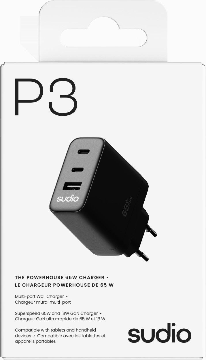 Le Sudio P3 est un chargeur USB-C à la fois puissant et compact, conçu comme un compagnon idéal pour le quotidien mobile. Avec une puissance de sortie de 65 watts, il offre suffisamment d'énergie pour recharger rapidement et efficacement une multitude d'appareils, des ordinateurs portables et tablettes aux smartphones et écouteurs intra-auriculaires. Son design minimaliste en fait un accessoire peu encombrant pour le travail au bureau, à la maison ou en voyage dans le monde entier. Associé à un câble de chargement adapté, le Sudio P3 garantit une alimentation électrique fiable et rapide, où que tu sois.