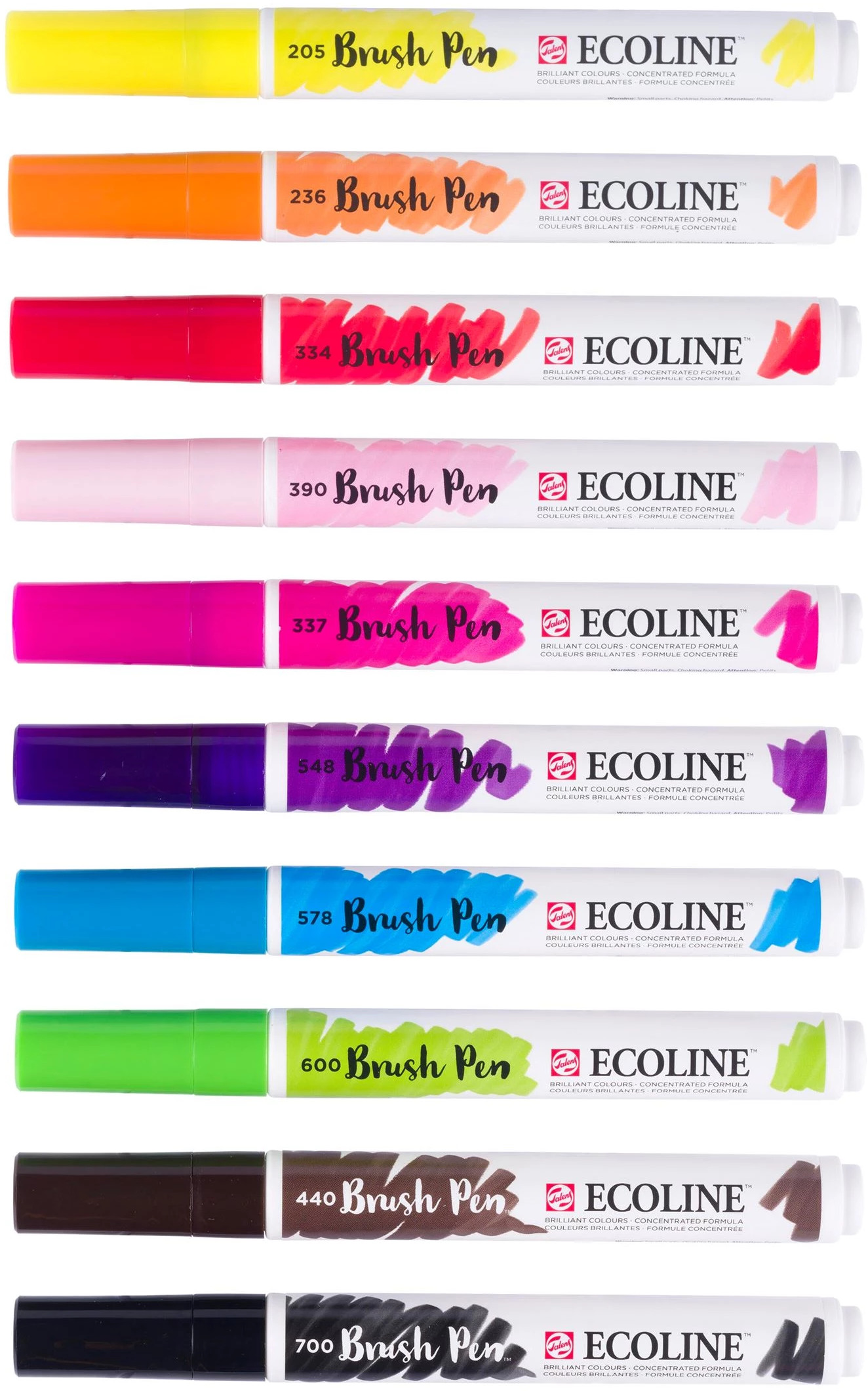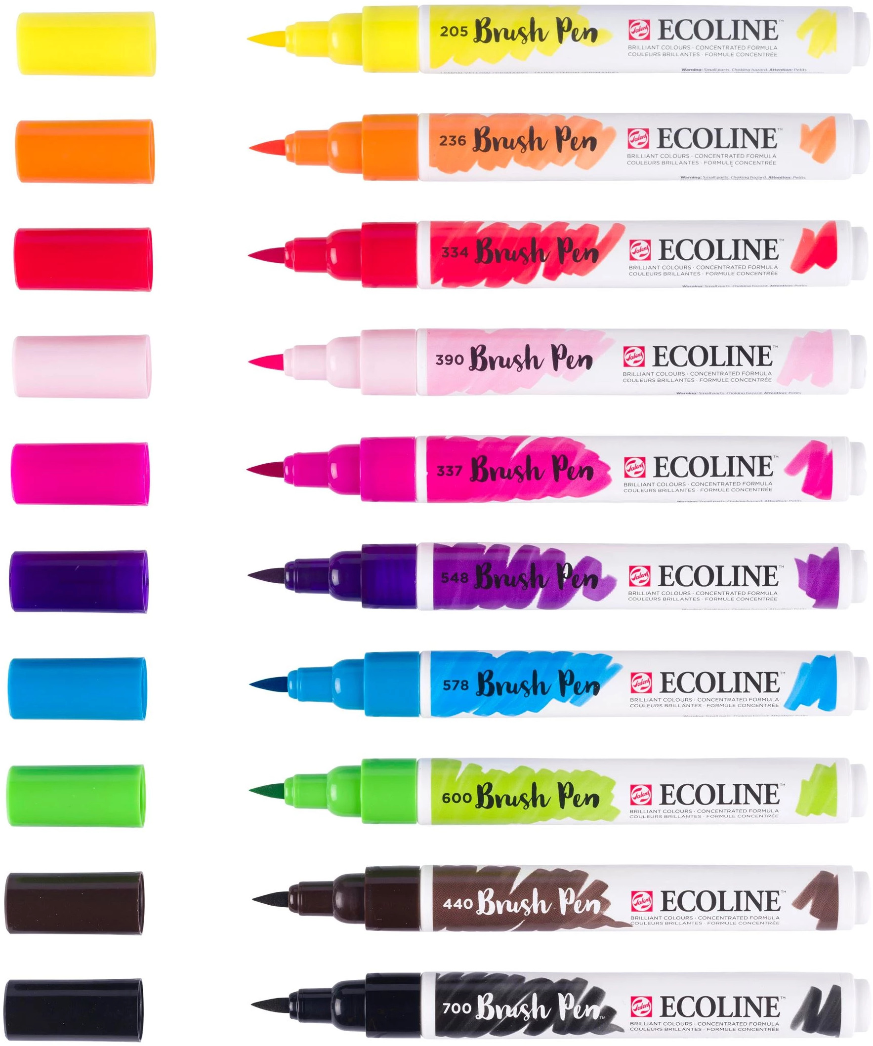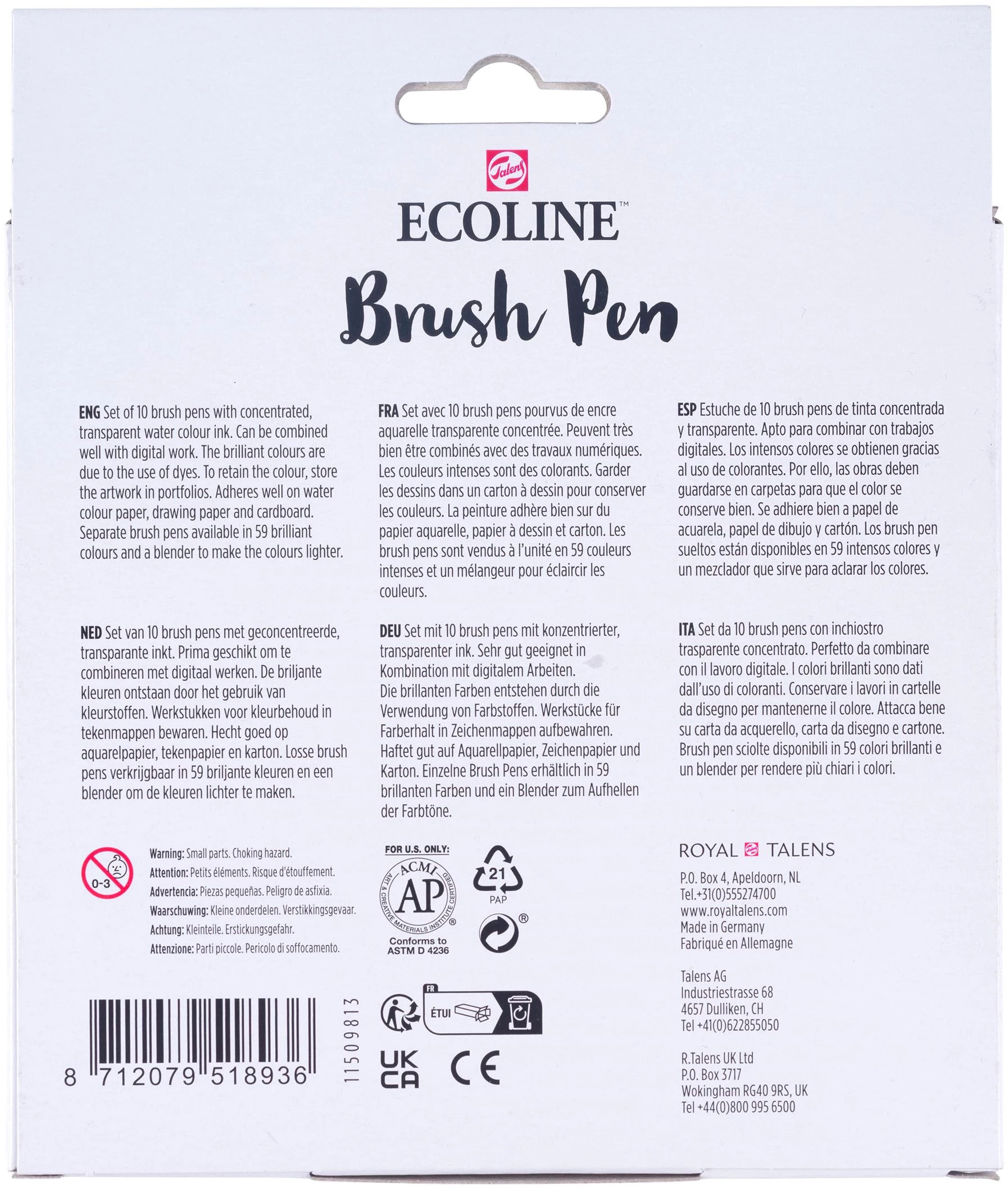 Talens Ecoline Set avec 5 Brush Pens est à base de colorants et de gomme arabique. Les couleurs de Talens Ecoline sont d'une clarté et d'une brillance inimaginables. Si vous le souhaitez, vous pouvez réduire l'intensité de la couleur en la diluant avec de l'eau ou à l'aide du Brush Pen Blender. Les œuvres originales doivent être conservées dans un porte-documents pour une conservation optimale des couleurs. La formule concentrée des Brush Pens Talens Ecoline permet une transition en douceur avec Talens Ecoline en flacons. Le Brush Pen Blender spécial permet de mélanger ou d'estomper les couleurs, il peut également être utilisé pour créer de magnifiques délavages et transitions de couleurs. Vous avez oublié de fermer le capuchon de votre Brush Pen ? Une pointe de pinceau séchée peut être facilement sauvée en l'humidifiant avec de l'eau.