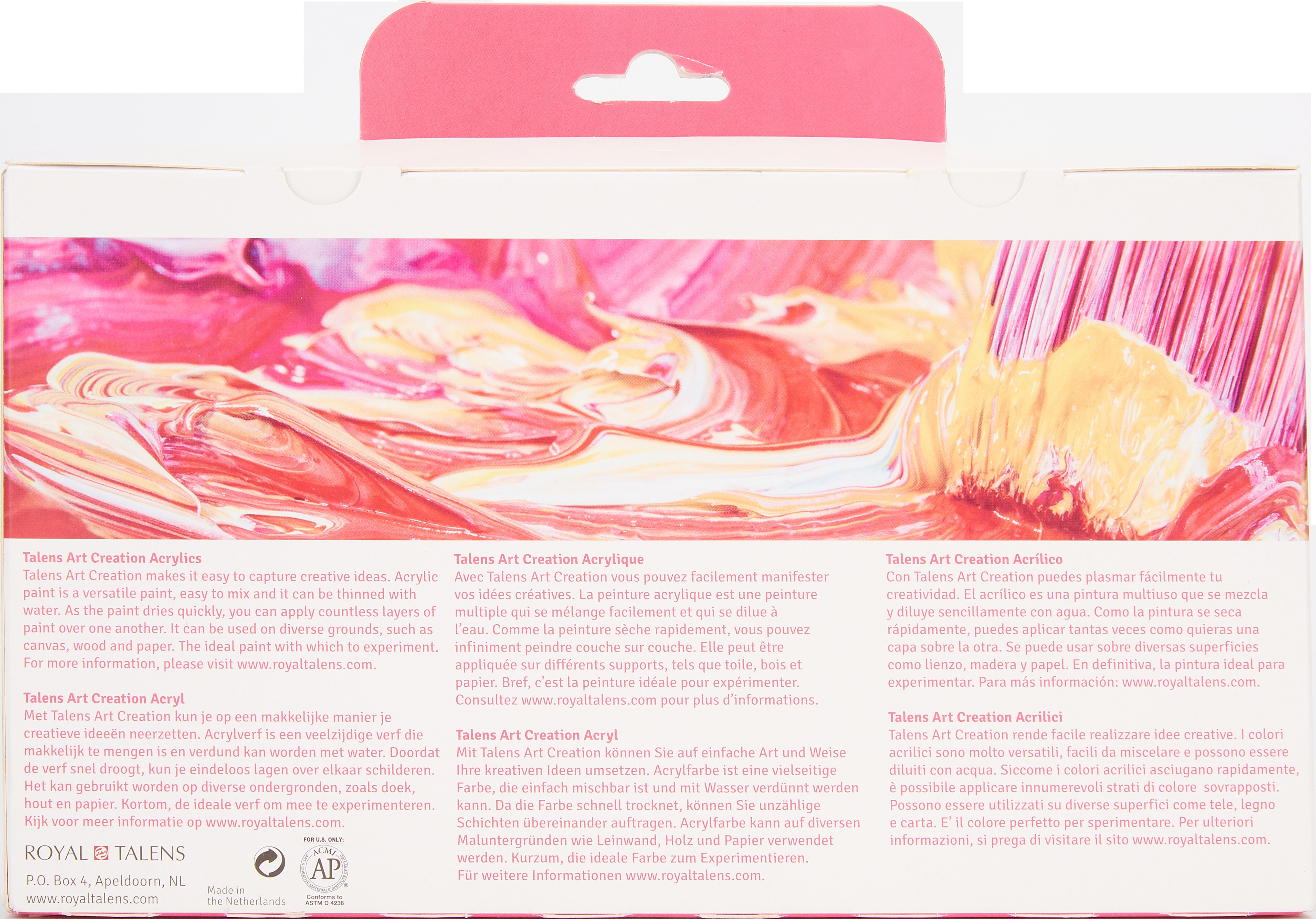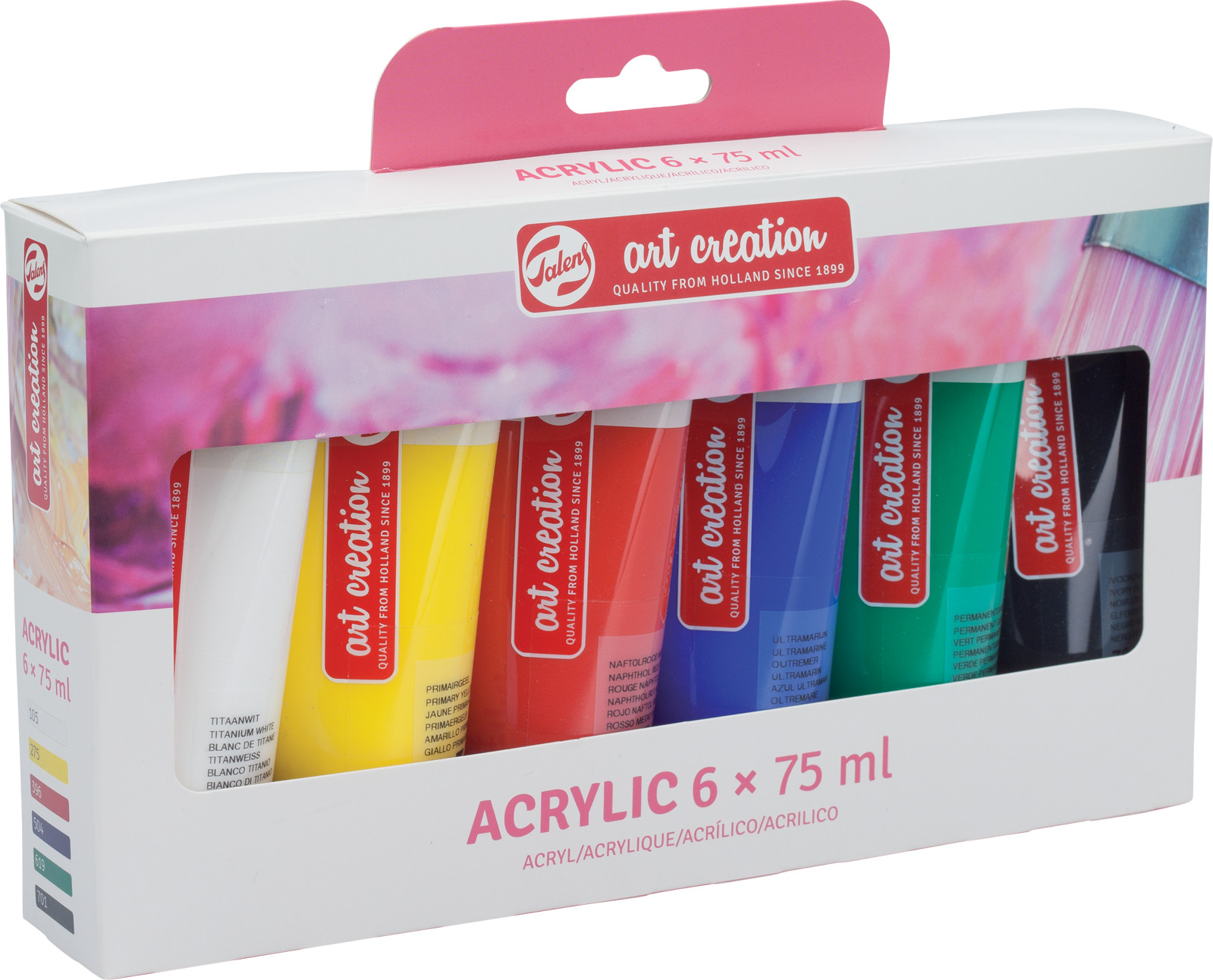 Dieses Acrylfarben-Set mit 6 x 75 ml Tuben bietet eine grossartige Grundpalette an Farben, mit denen Sie verschiedene Gemälde erstellen können. Diese grösseren Tuben mit den gängigsten Farben sollten Sie unbedingt in Ihrer Sammlung haben! Talens Art Creation bietet diese Tuben auch in einem 12er-Set, mehreren Sets mit kleineren Tuben und einem Starterset an, das alles enthält, was Sie für den Einstieg in die Acrylmalerei benötigen. Inhalt: 6 x 75-ml-Tuben (105 Titanweiss – 275 Primärgelb – 396 Naphtholrot mittel – 504 Ultramarin – 619 Permanentgrün dunkel – 701 Elfenbeinschwarz). Über Talens Art Creation Acrylfarben Talens Art Creation Acrylfarbe ist eine zuverlässige Qualitäts-Acrylfarbe auf Acrylharzbasis. Die Farbe hat eine pastose Konsistenz, trocknet schnell und hat nach dem Trocknen einen seidigen Glanz. Diese Acrylfarben können direkt aus der Tube oder mit Wasser verdünnt verwendet werden und sind nach dem Trocknen wasserfest. Die Farben lassen sich leicht miteinander mischen und sind dank der Dosierkappe einfach zu verwenden. Diese vielseitige Farbe kann auf fast allen Untergründen verwendet werden, sofern diese einigermassen saugfähig und frei von Fett und Staub sind: von Leinwand und Papier bis hin zu Gips, Pappe, Holz, Stein und Zement. Da die Tuben transparent sind, können Sie beim Malen leicht die gewünschte Farbe auswählen.
