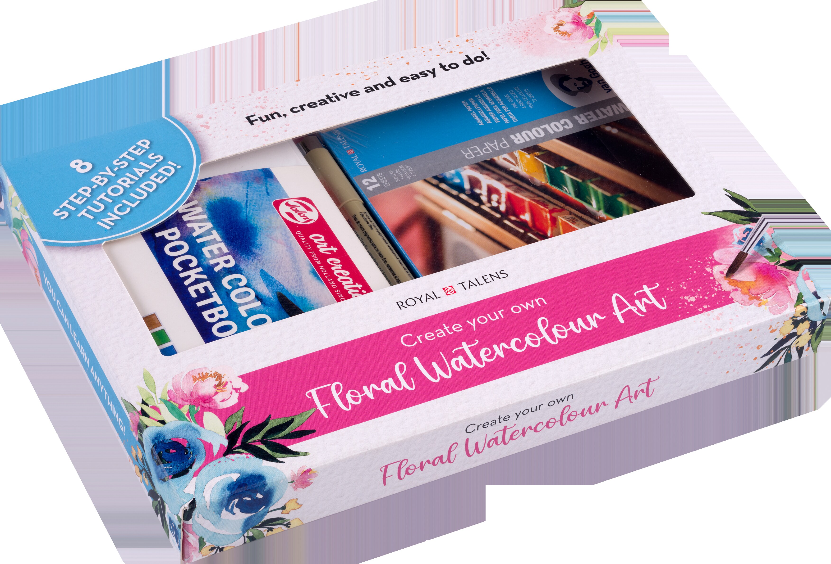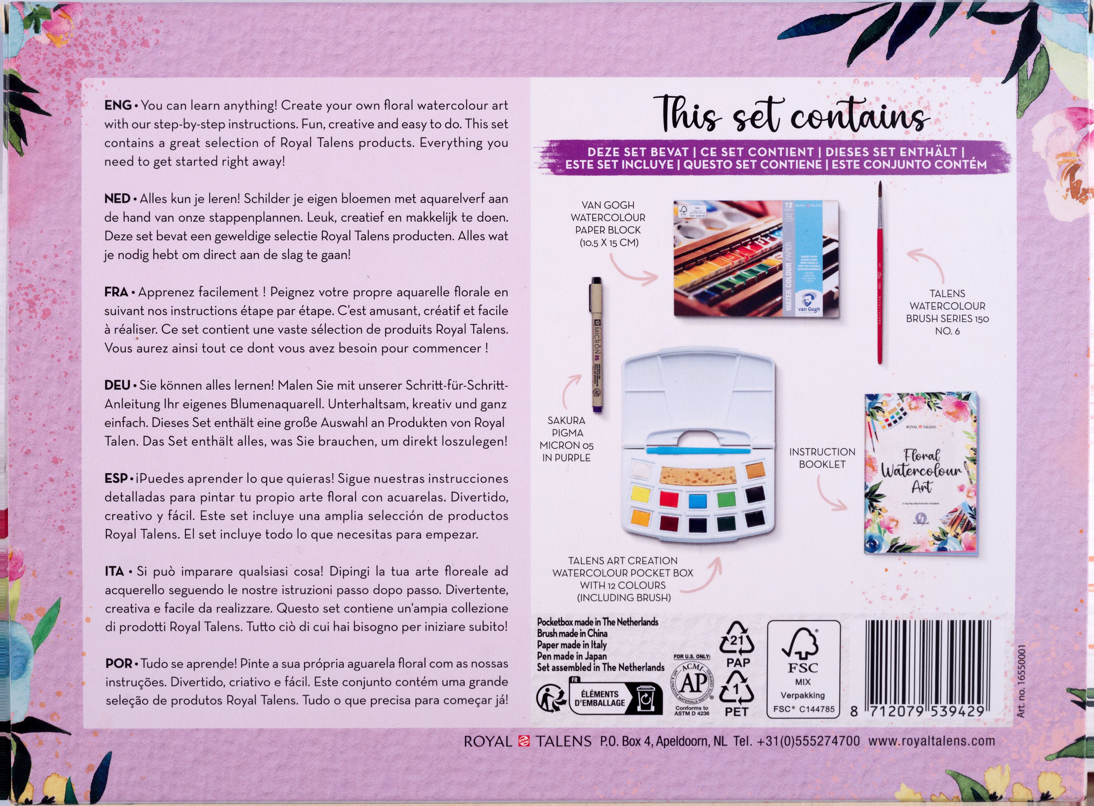 Mit dem neuen Malset Blumen begeben Sie sich auf eine Reise in die wunderbare Welt der Aquarelle! Mit allen wichtigen Grundlagen und 8 inspirierenden Schritt-für-Schritt-Lektionen lernen Sie, bezaubernde Rosen, Gänseblümchen, Pfingstrosen und mehr zu malen. Lassen Sie Ihrer Kreativität freien Lauf, um ganz leicht wunderschöne Blumenkunst zum Leben zu erwecken. Inhalt: Anleitungsheft, Sakura Pigma Micron 05 in Purpur, Talens Art Creation Aquarellkasten, Talens Aquarellpinsel Serie 150 Nr. 6, Van Gogh Aquarellpapier 10,5 x 15