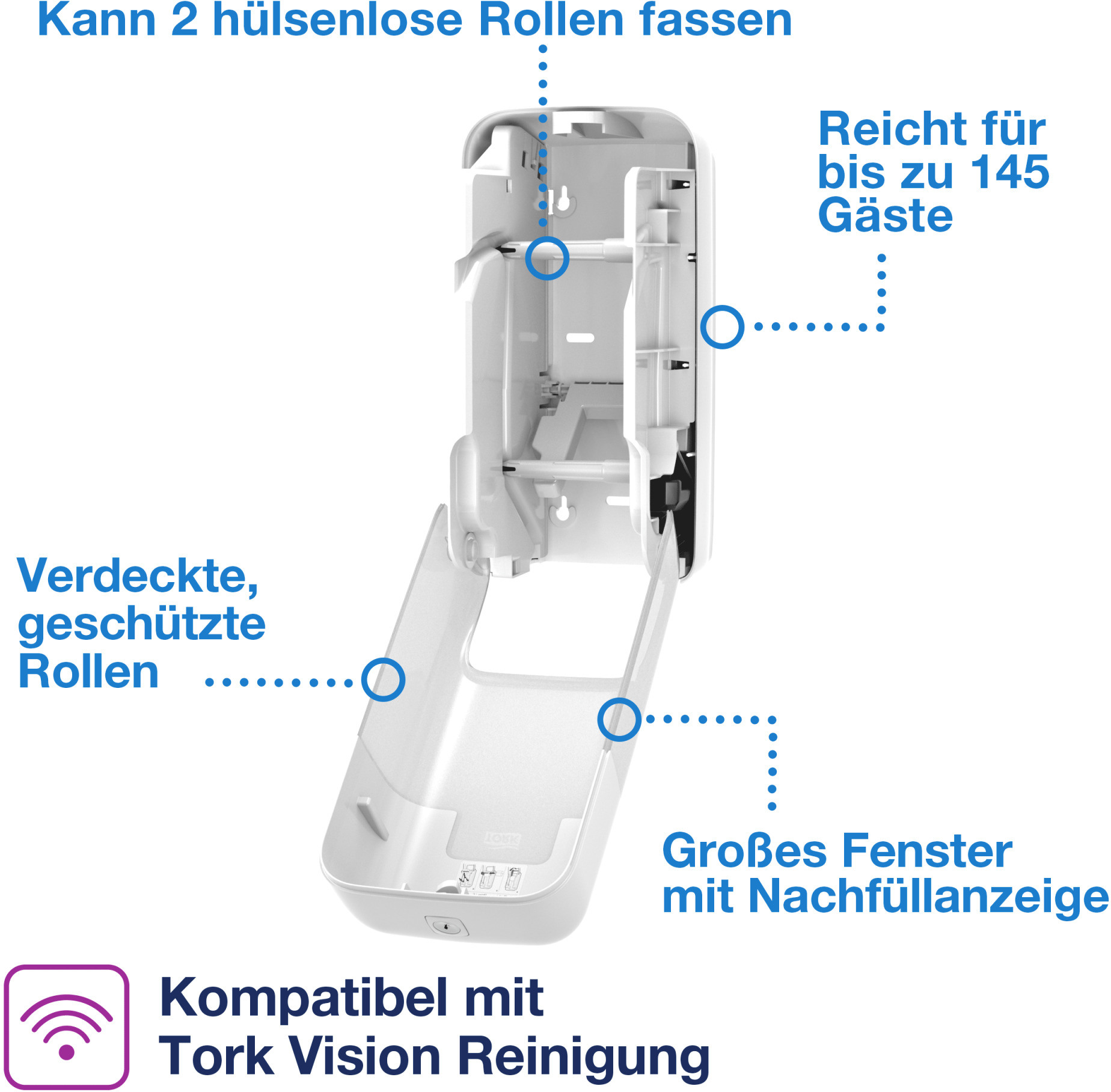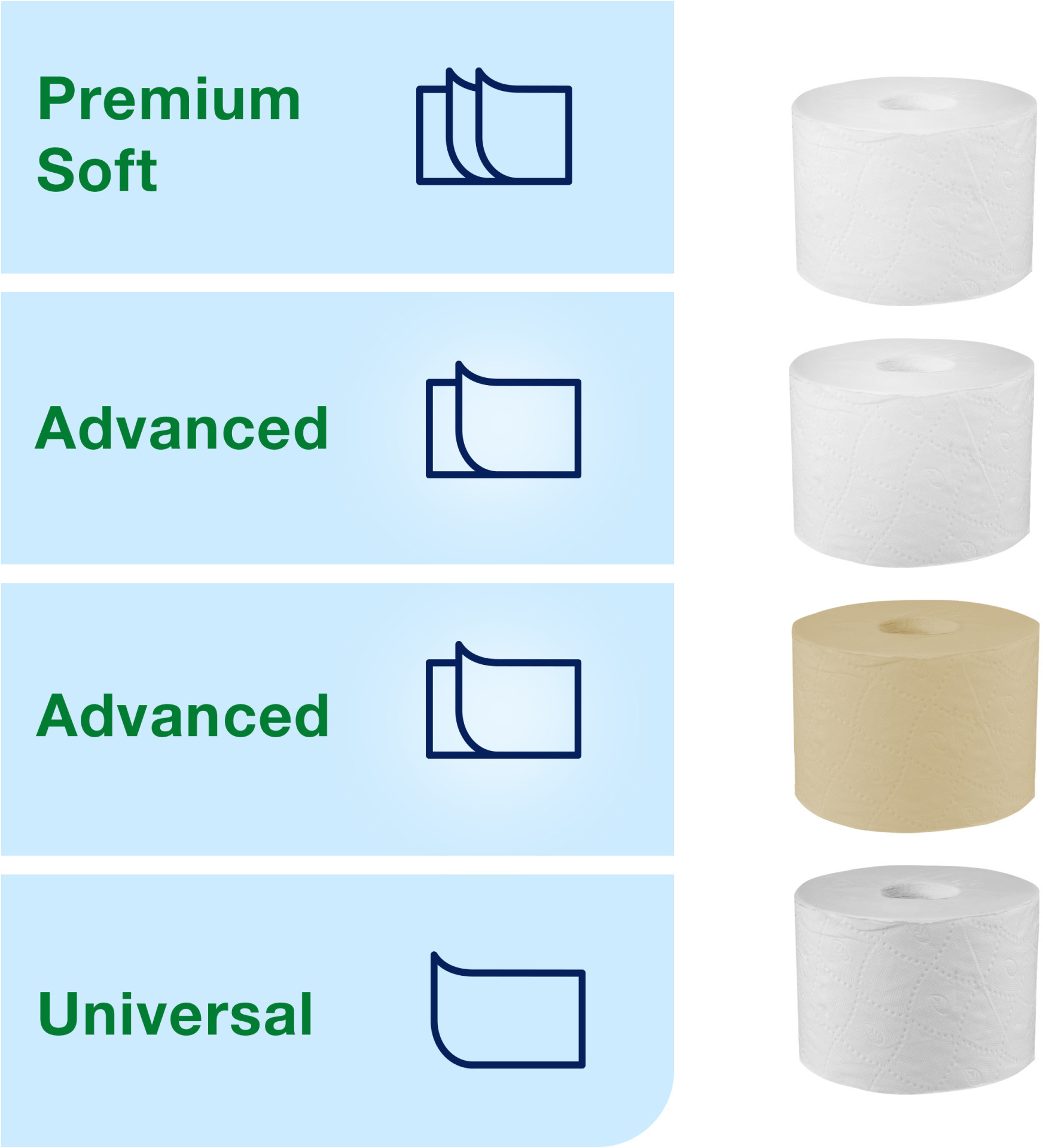 Tork OptiServe® Coreless est un système de papier toilette performant pour les établissements où l'efficacité, la durabilité et une expérience utilisateur agréable sont des priorités. Il constitue une meilleure alternative au papier hygiénique traditionnel et au papier hygiénique Jumbo traditionnel. La large gamme de distributeurs permet de répondre aux différents besoins d'un établissement avec un seul type de papier toilette. Par rapport au papier hygiénique traditionnel, le papier hygiénique sans mandrin Tork OptiServe peut contenir 3 fois plus de papier et est livré sans mandrin ni suremballage, ce qui réduit considérablement les déchets.