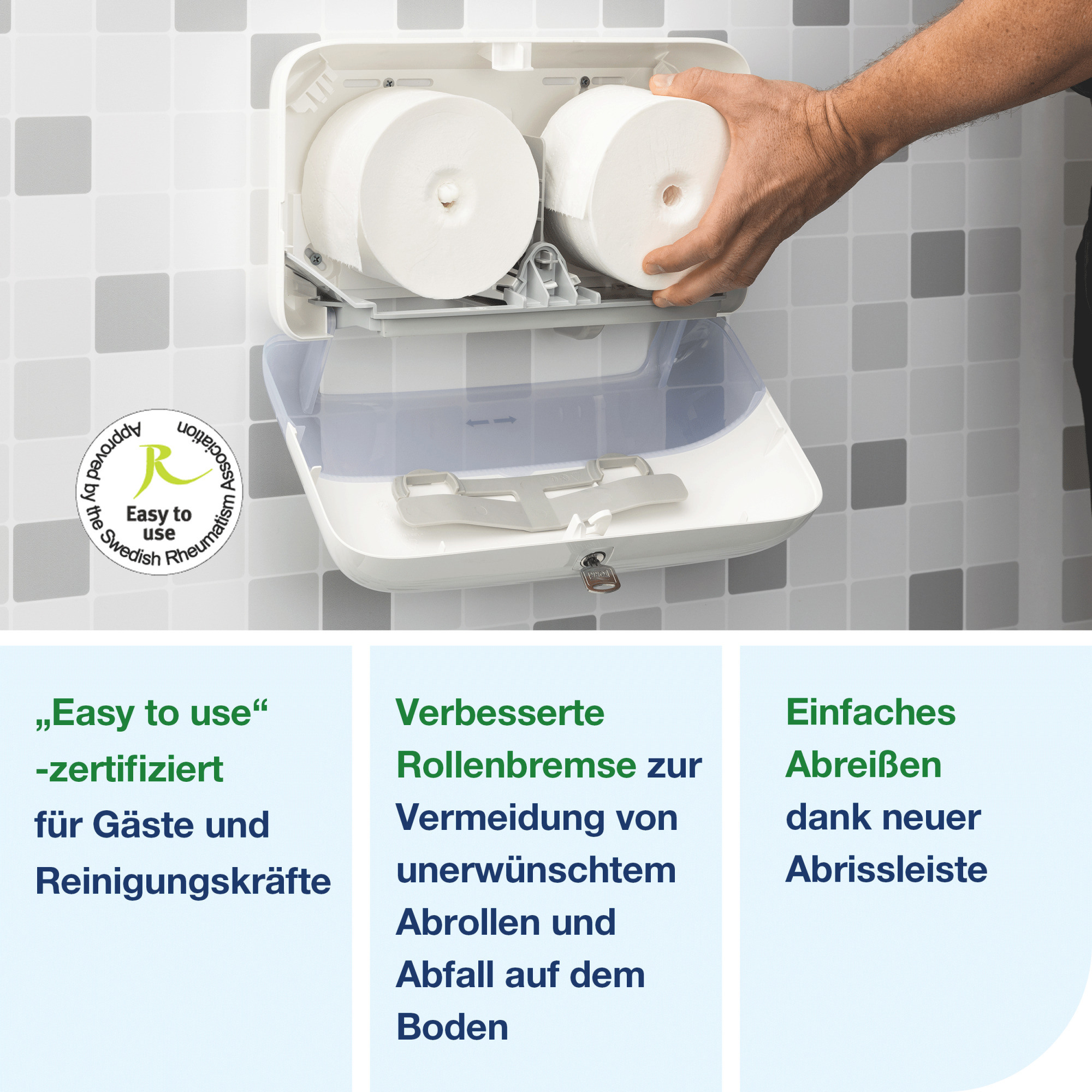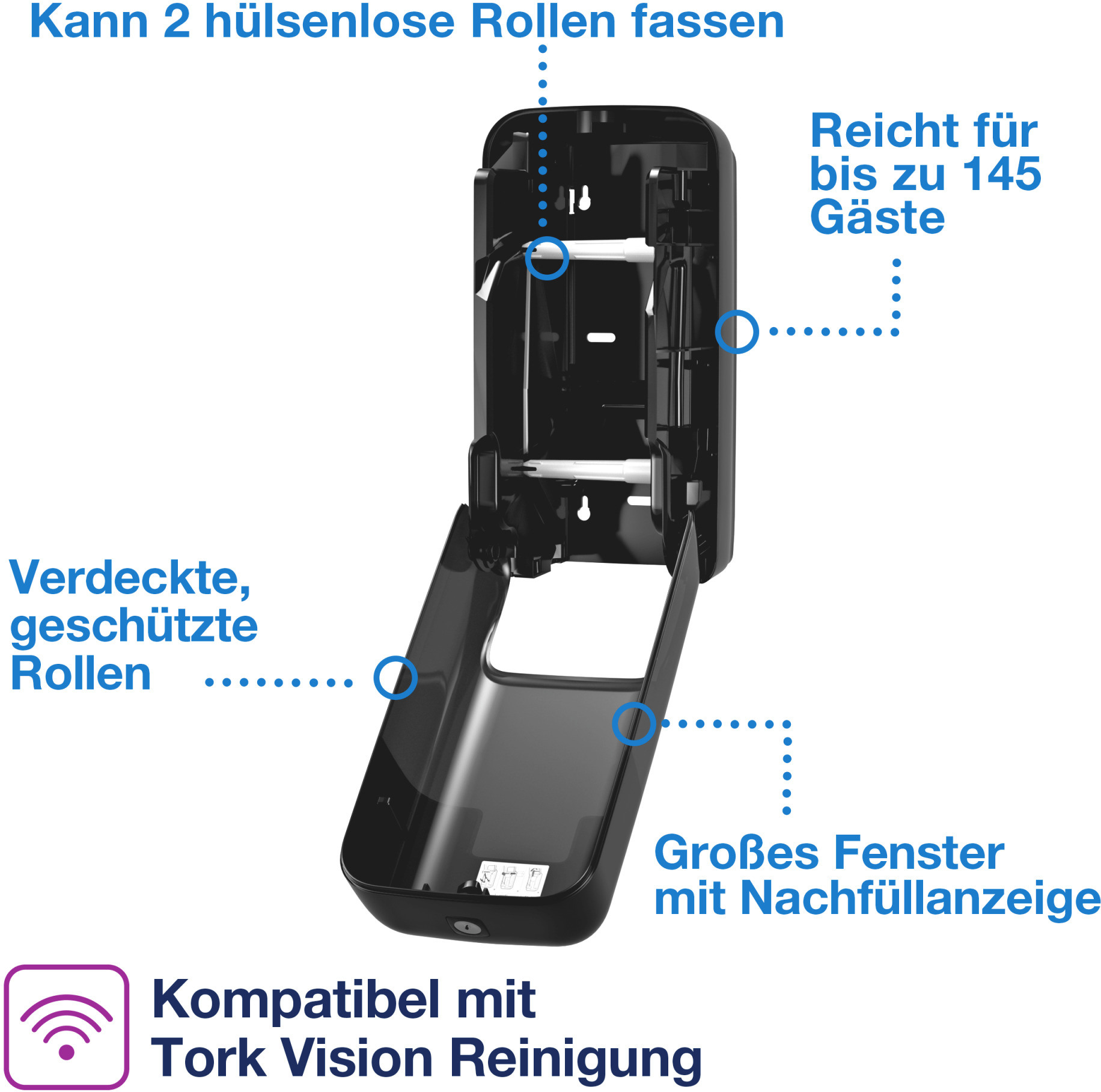 Tork OptiServe® Coreless est un système de papier toilette performant pour les établissements où l'efficacité, la durabilité et une expérience utilisateur agréable sont des priorités. Il constitue une meilleure alternative au papier hygiénique traditionnel et au papier hygiénique Jumbo traditionnel. La large gamme de distributeurs permet de répondre aux différents besoins d'un établissement avec un seul type de papier toilette. Par rapport au papier hygiénique traditionnel, le papier hygiénique sans mandrin Tork OptiServe peut contenir 3 fois plus de papier et est livré sans mandrin ni suremballage, ce qui réduit considérablement les déchets.