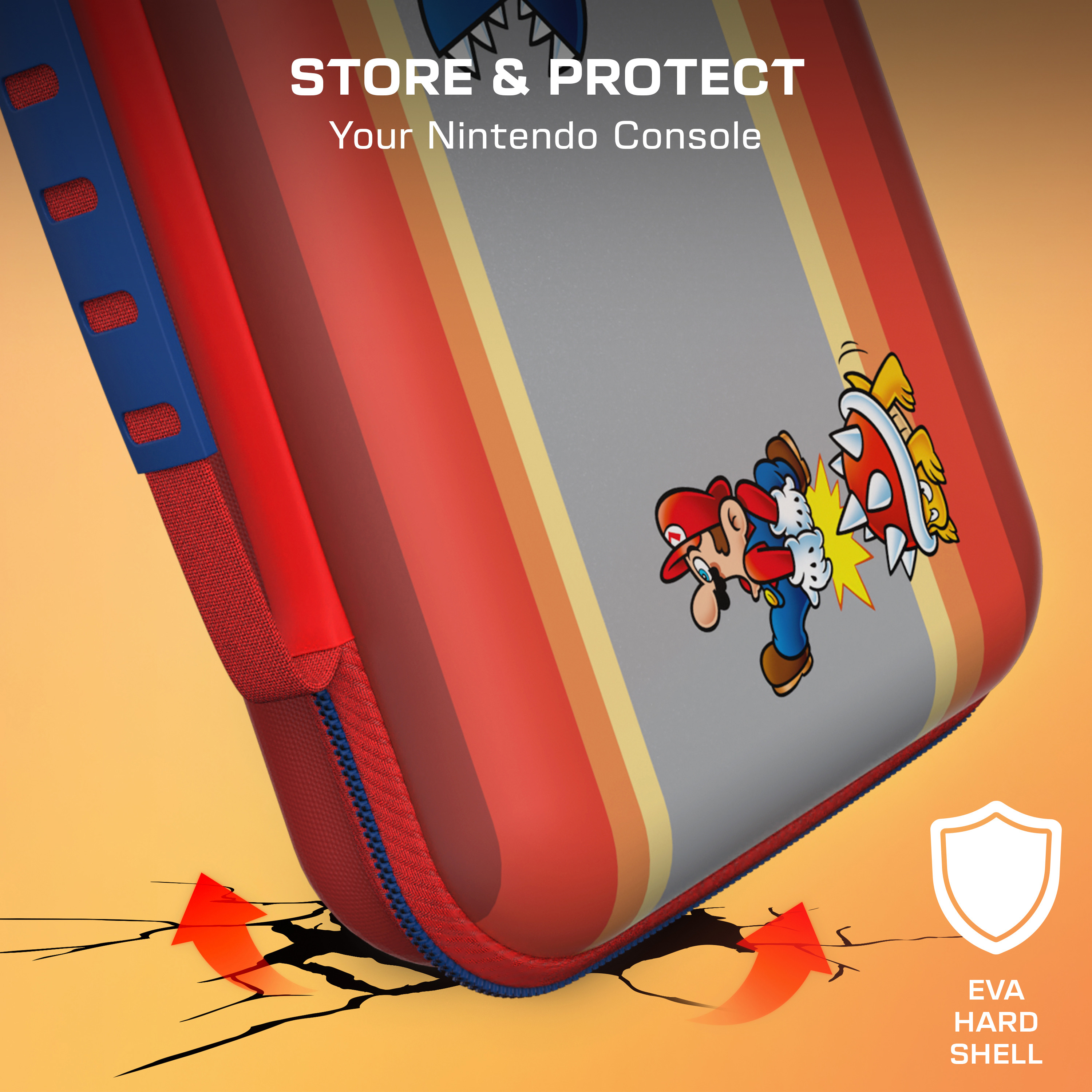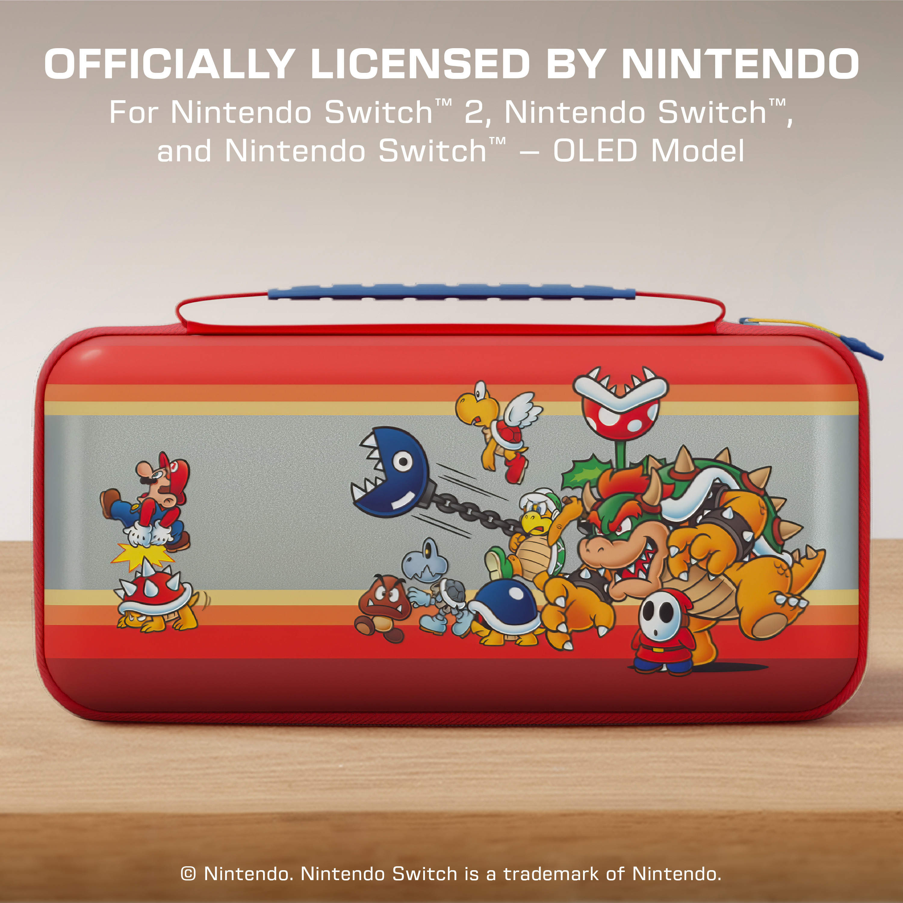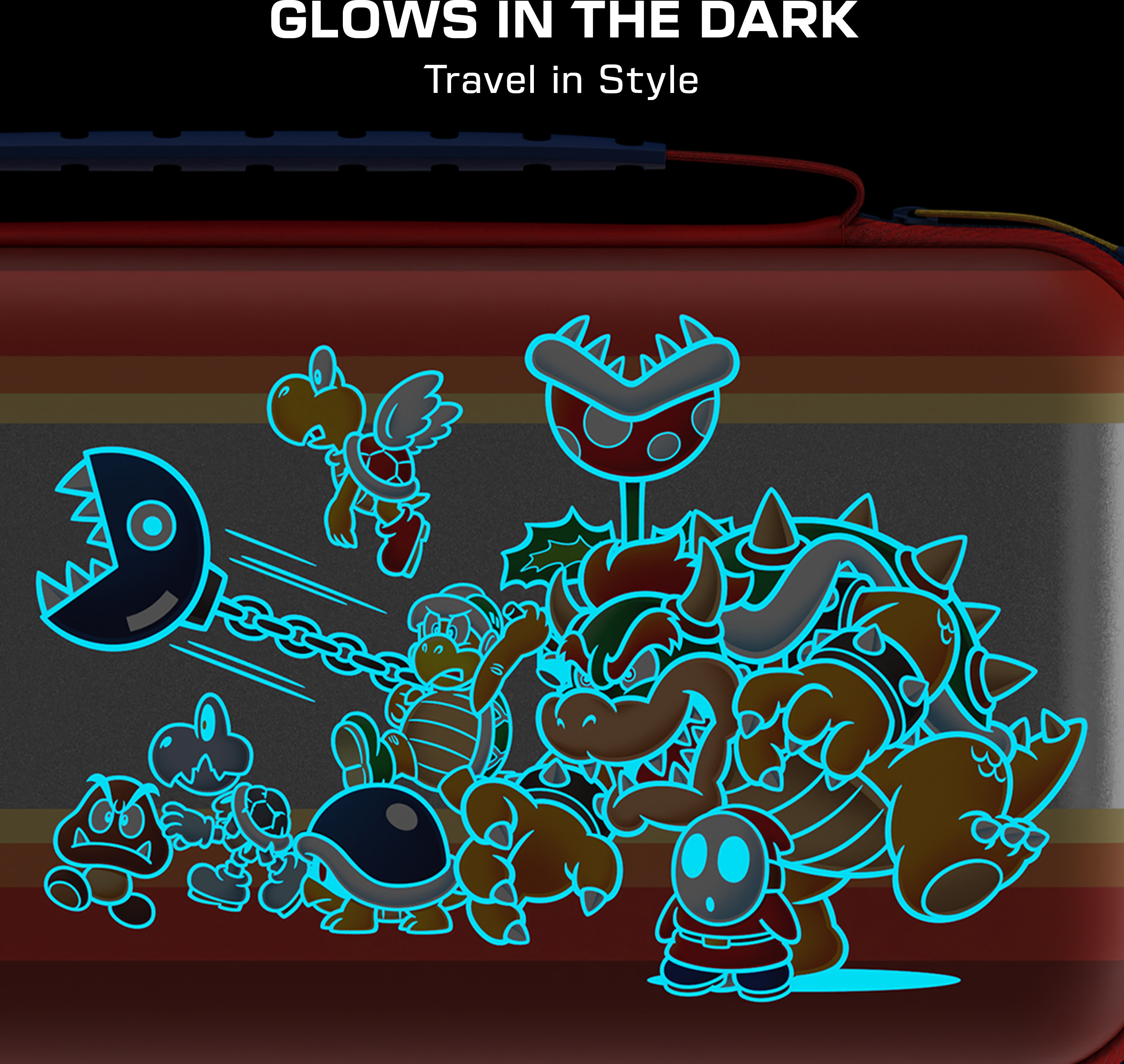 Mit dem offiziell lizenzierten PlayTrek™-Reiseetui für Nintendo Switch™ 2 kannst du selbstbewusst verreisen. Diese Koopa Troop-Edition hat ein cooles Design, das im Dunkeln leuchtet und Bowsers legendäre Handlanger richtig gut zur Geltung bringt. Dieses robuste Etui ist auch mit Nintendo Switch™ und Nintendo Switch™ - OLED-Modell kompatibel und verfügt über eine widerstandsfähige, geformte EVA-Schale sowie eine PU-Lederoptik-Außenhülle für zusätzlichen Schutz. Eine gepolsterte Klappe schützt den Bildschirm und dient gleichzeitig als Halterung für Spielkarten, während eine Netztasche Zubehör ordentlich verstaut.