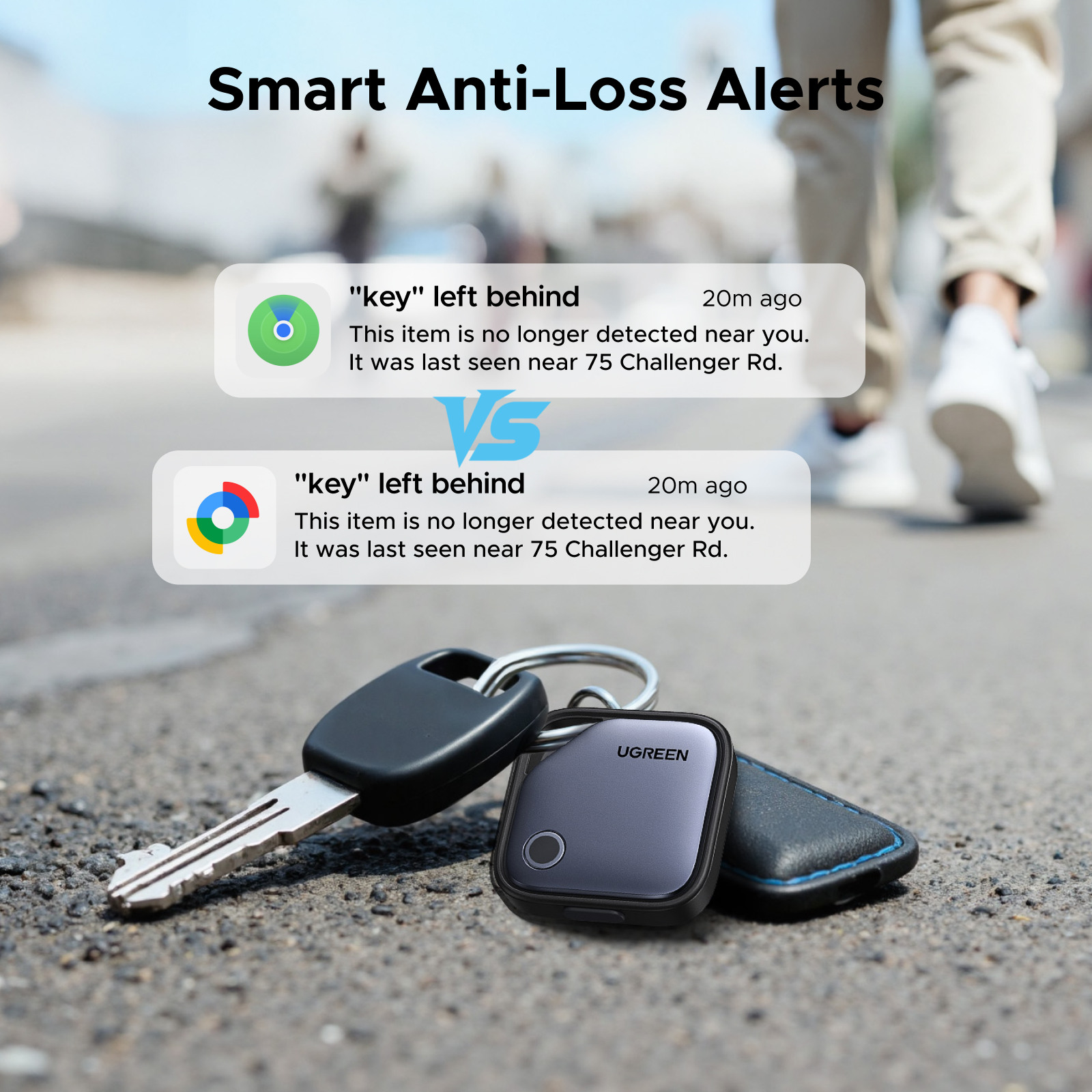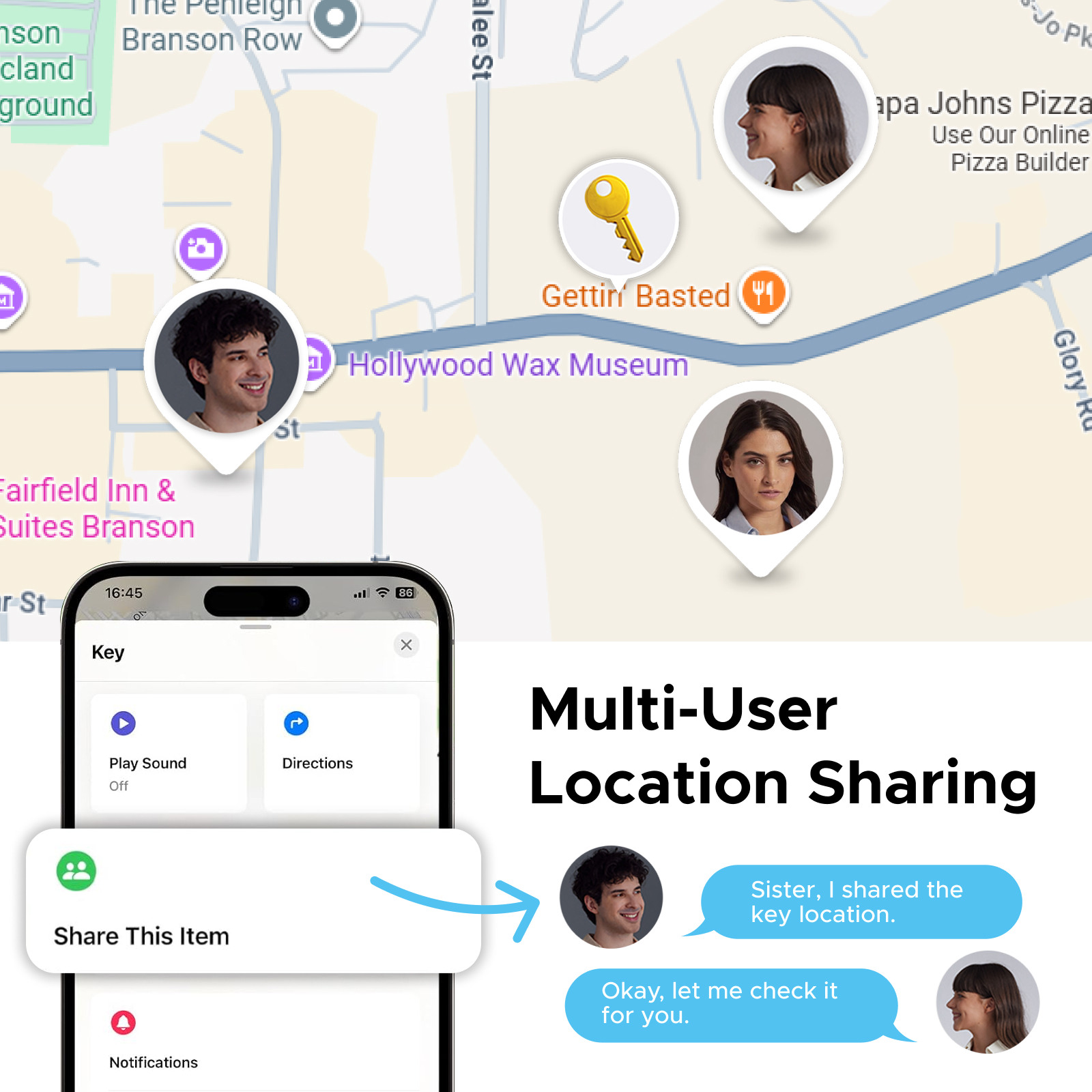 Trouver & partager facilement avec la famille avec des appareils iOS ou Android : Couplez rapidement le FineTrack Duo Air Tracker Tag avec votre iPhone ou votre smartphone Android d'une simple pression du doigt. Ajoutez le tag Air Tracker avec l'application Apple "Où est-on ?" ou l'application Google Find Hub dans l'onglet "Objets" pour trouver et suivre instantanément vos clés, votre portefeuille et autres objets de valeur. Vous pouvez également partager l'emplacement de votre tracker avec les membres de votre famille afin que tous puissent vous aider à garder vos affaires en sécurité. (Remarque : le couplage simultané avec des appareils iOS et Android n'est pas possible).