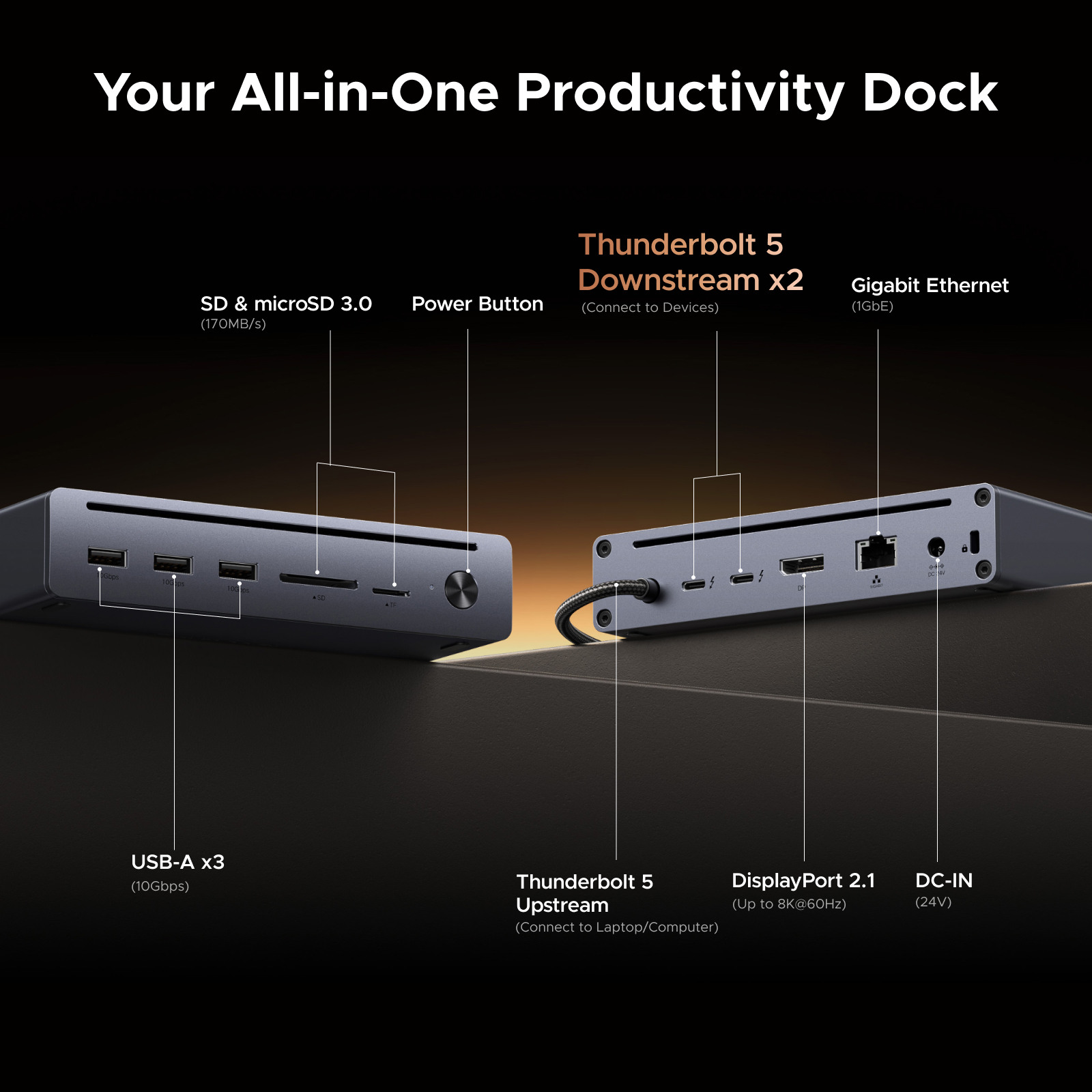 Concentrateur tout-en-un 10-en-1 ultime : réunit 10 fonctions essentielles dans une station d'accueil Thunderbolt 5 compacte et offre de puissantes fonctions de données, de chargement, d'affichage et de mise en réseau pour un espace de travail plus ordonné et plus efficace.